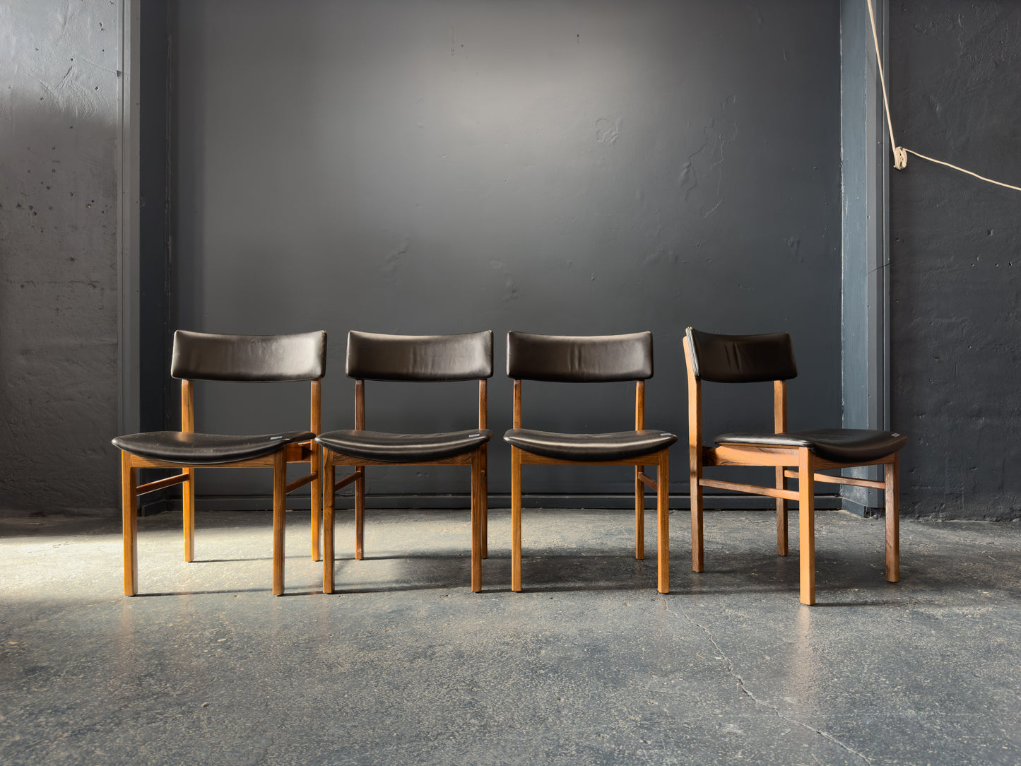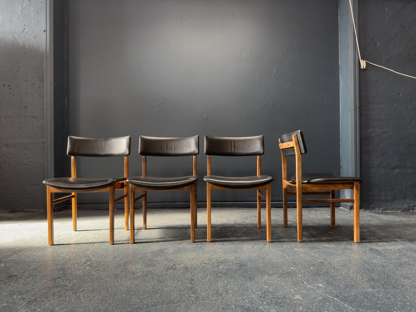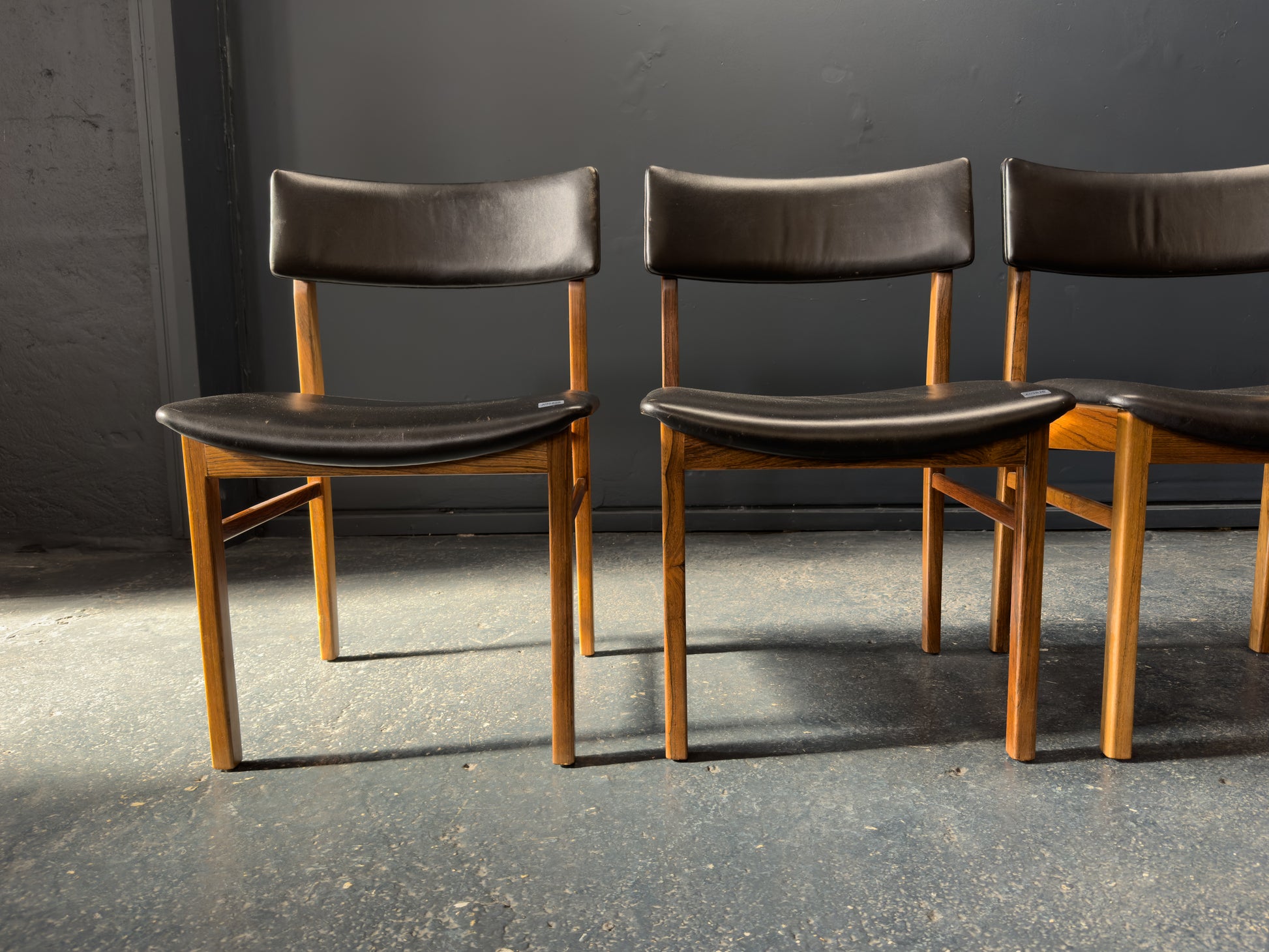 The chairs are upholstered in supple black leather, offering a luxurious contrast to the rosewood and providing lasting comfort. The gently curved backrests are designed for ergonomic support while maintaining a light, floating appearance. Their clean, understated lines and timeless materials make them a staple set.