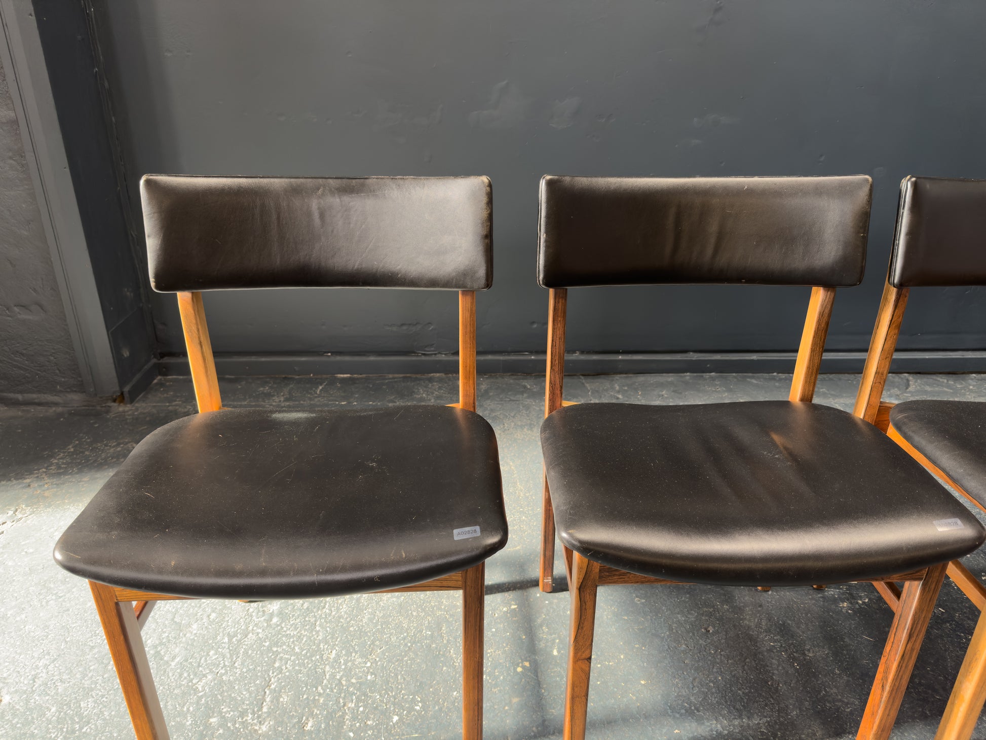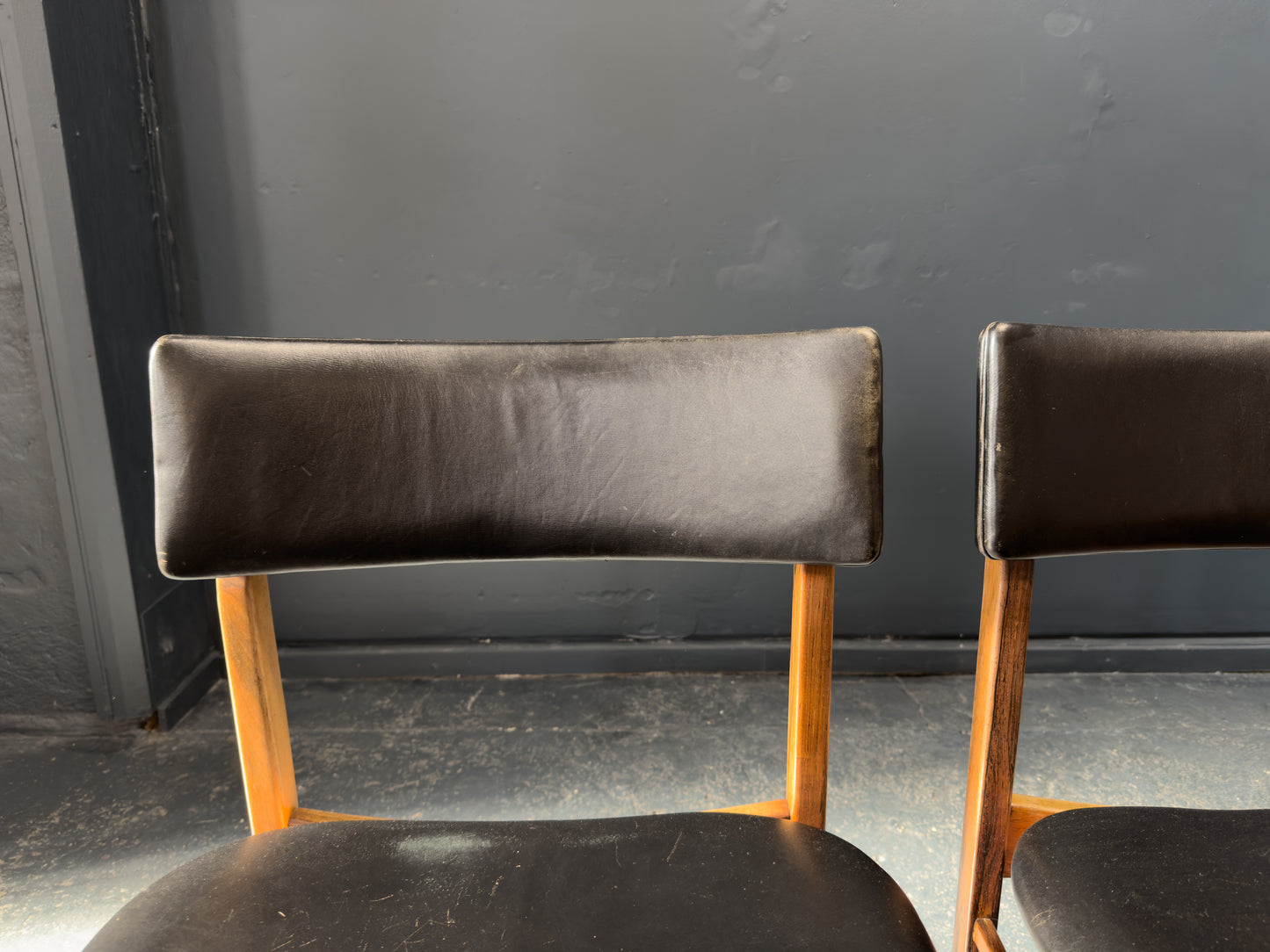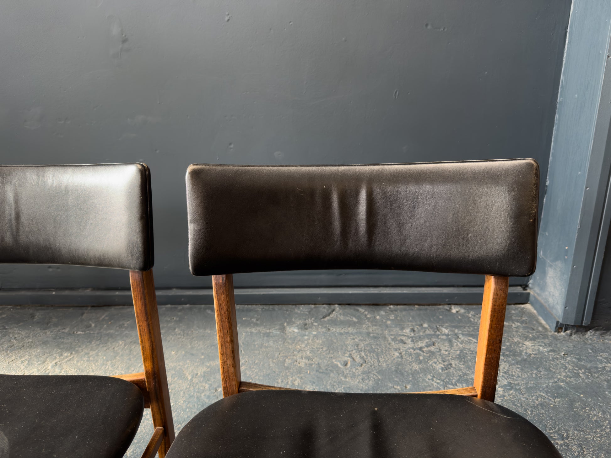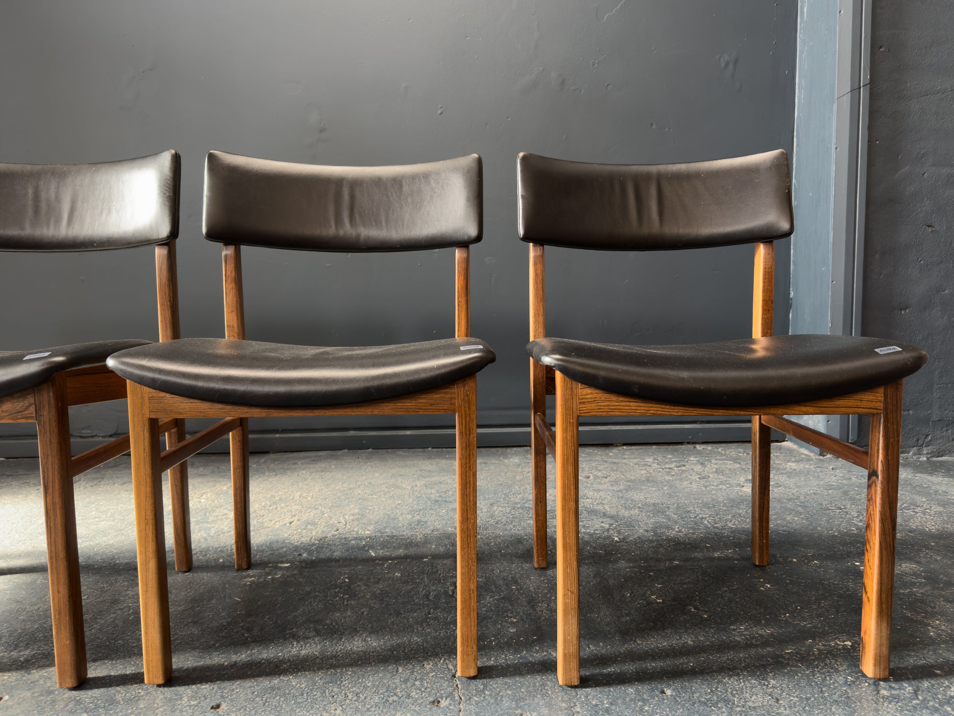 The chairs are upholstered in supple black leather, offering a luxurious contrast to the rosewood and providing lasting comfort. The gently curved backrests are designed for ergonomic support while maintaining a light, floating appearance. Their clean, understated lines and timeless materials make them a staple set.