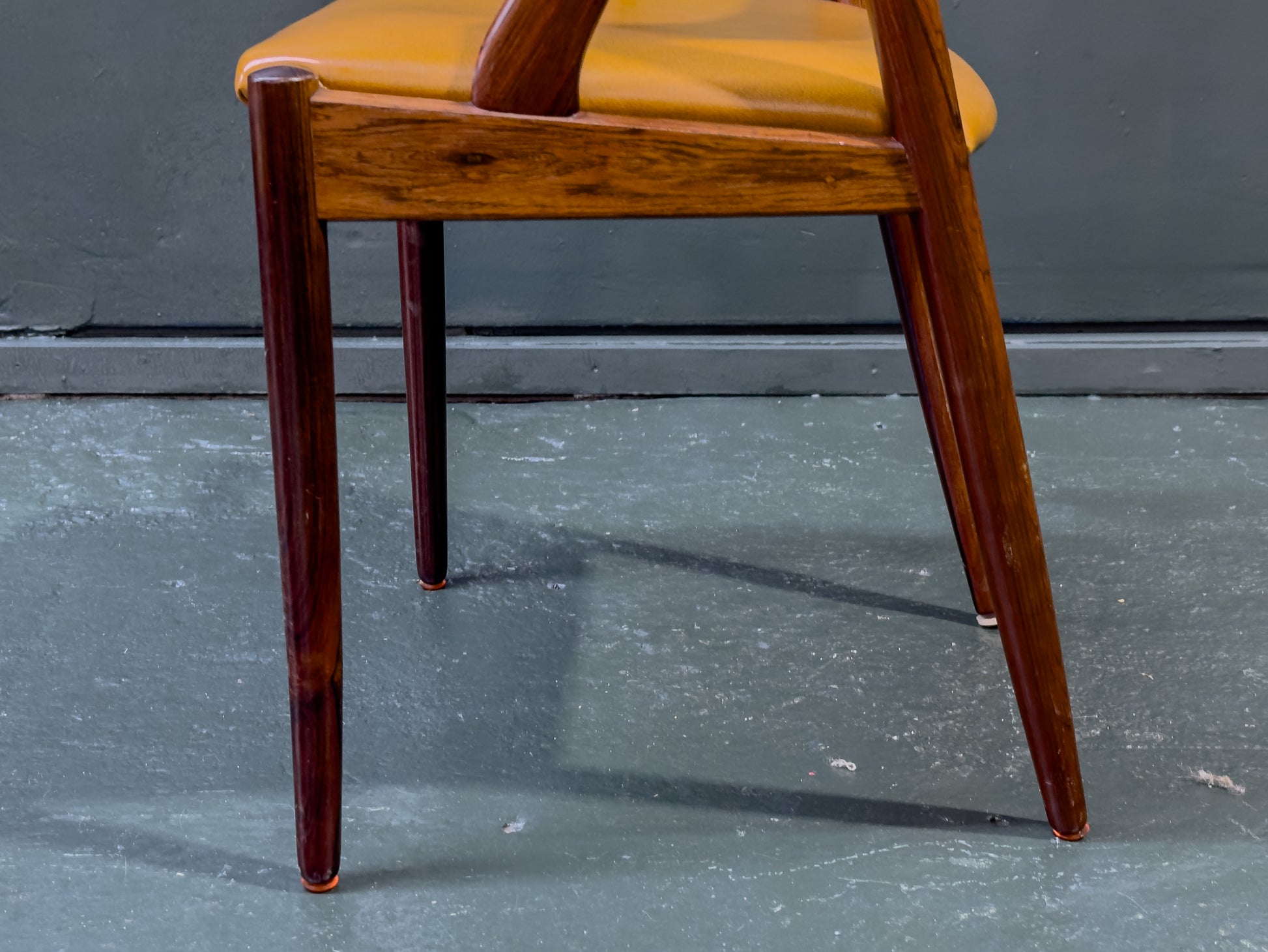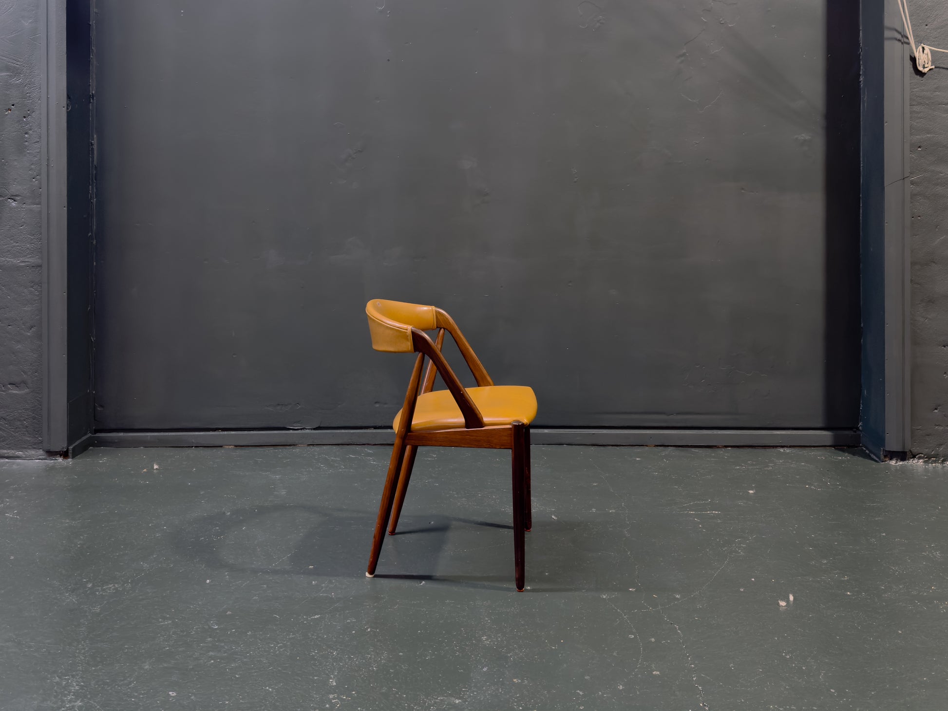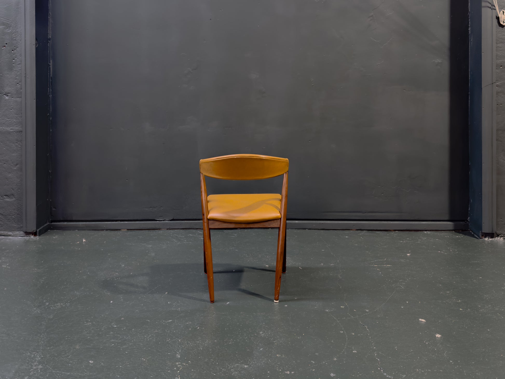 This set of six Model 31 dining chairs by Kai Kristiansen showcases a refined mid-century Danish design built around sculpted lines and precise joinery. Each chair is defined by its distinctive curved backrest rail, which forms a smooth horizontal arc and flows directly into the rear supports, creating a continuous, wraparound gesture.