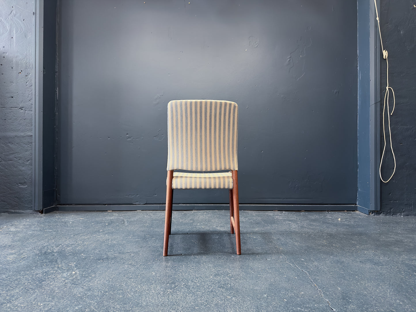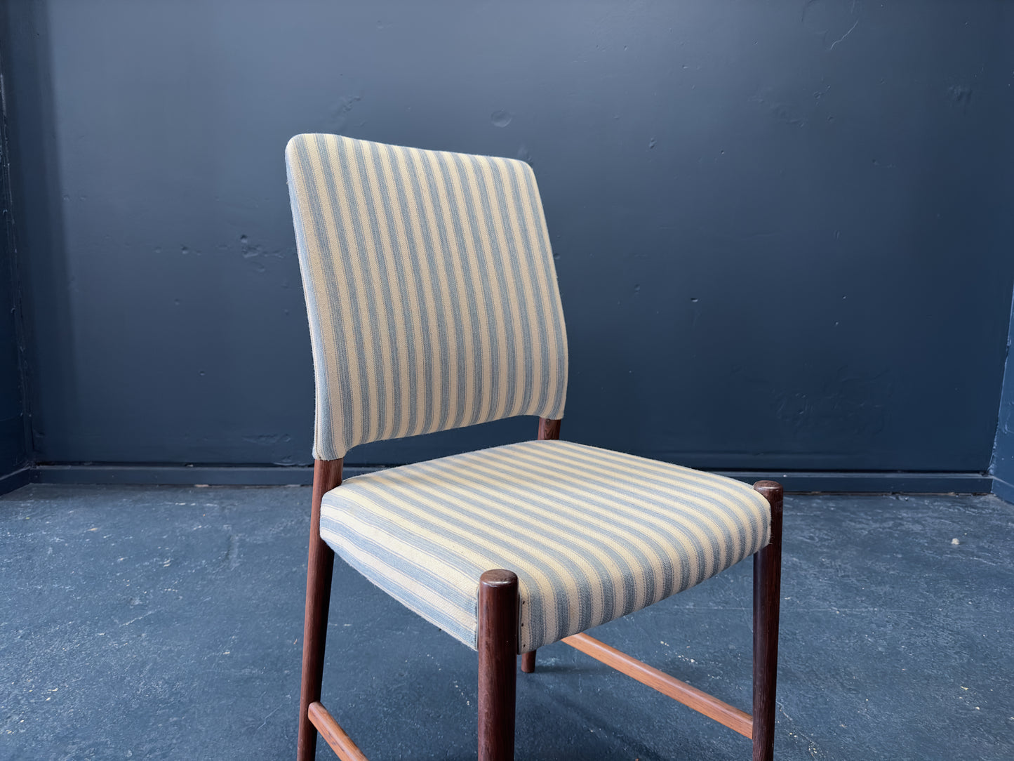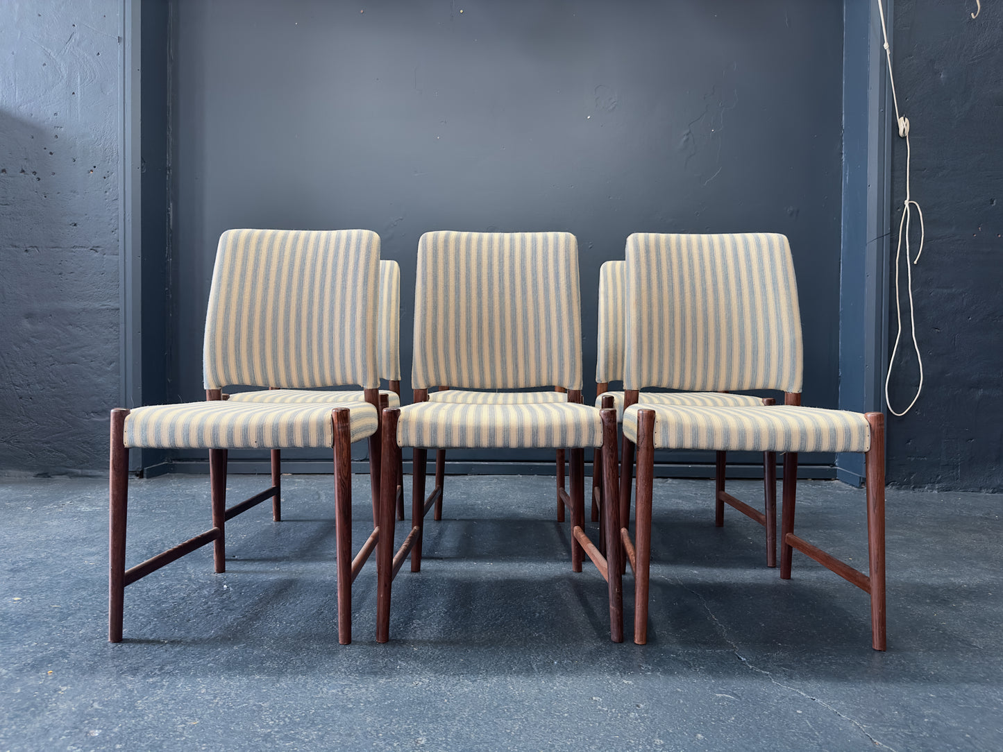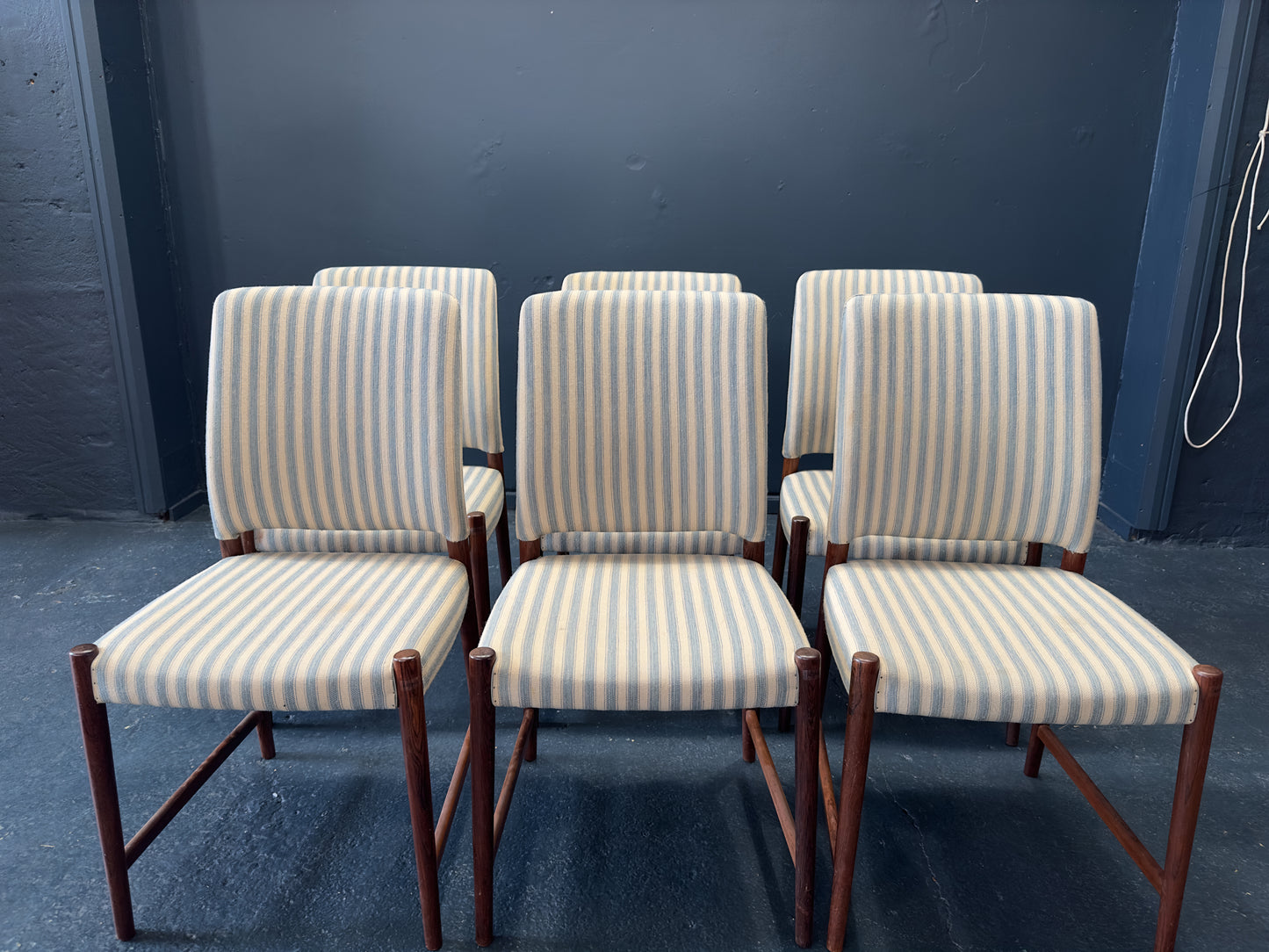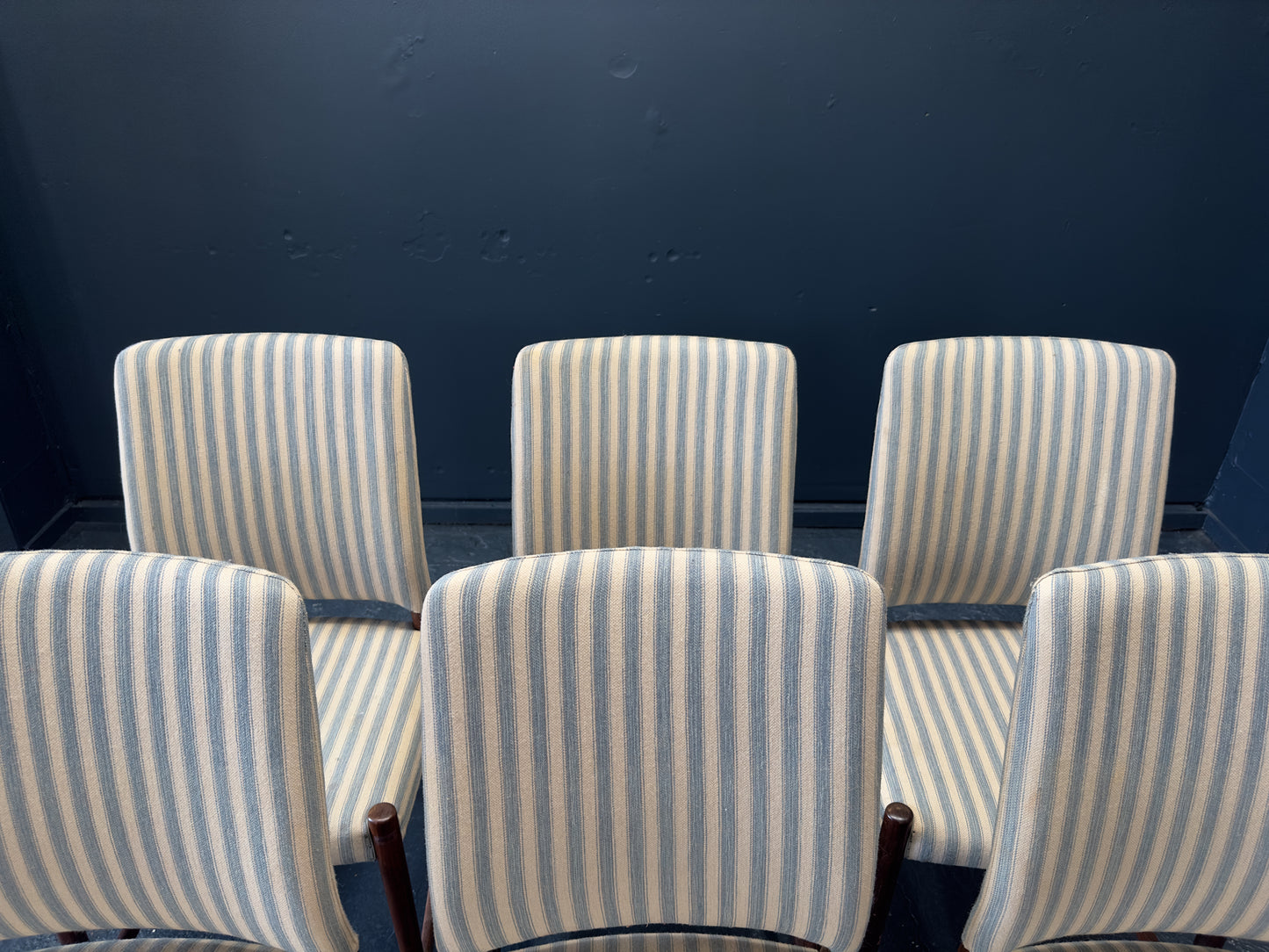 This stunning set of six dining chairs, feature a timeless baby blue and cream striped upholstery. The chairs are very classic in shape with a slightly curved rectangular backrest, set on an exposed rosewood frame. The rich deep grain and colour of the wood complement the light soft tones of the fabric beautifully.