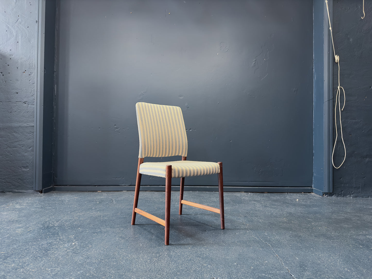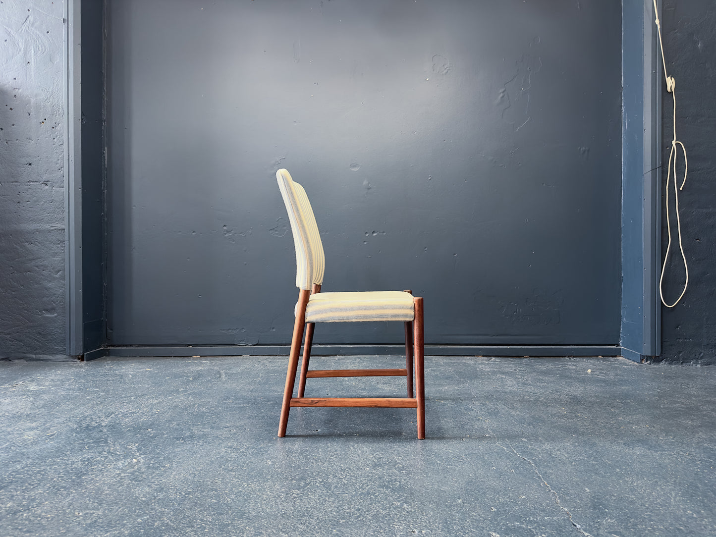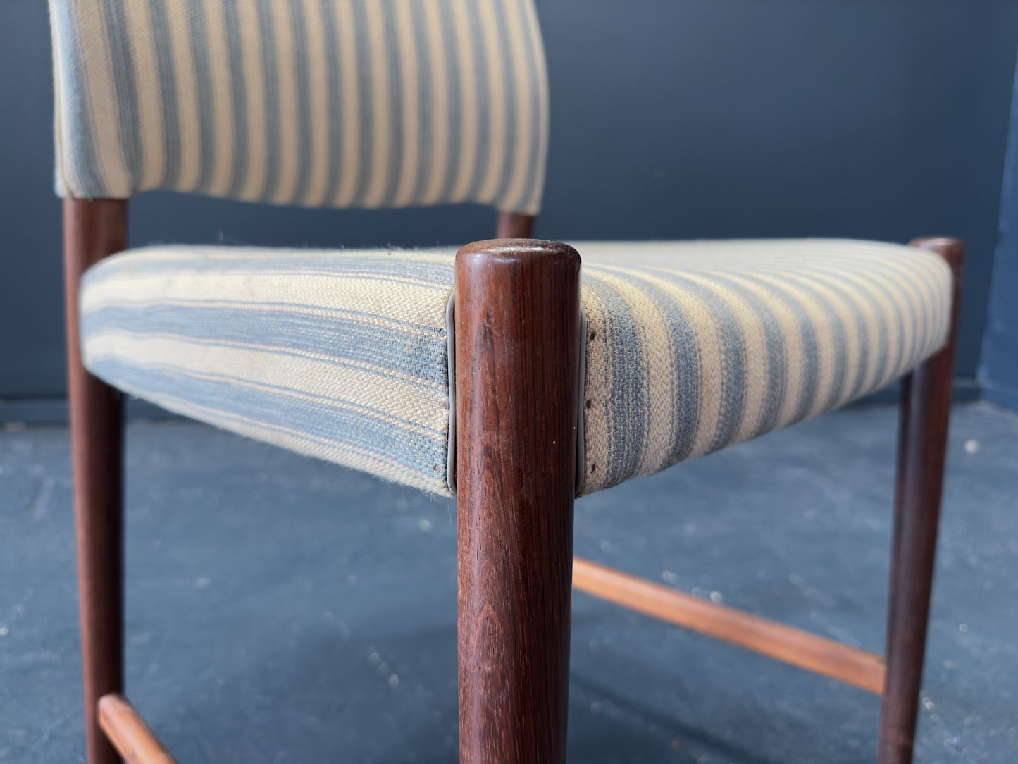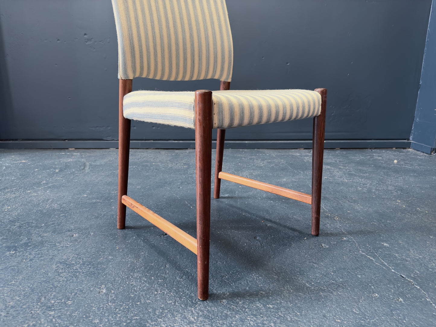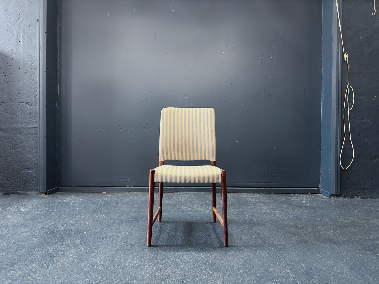This stunning set of six dining chairs, feature a timeless baby blue and cream striped upholstery. The chairs are very classic in shape with a slightly curved rectangular backrest, set on an exposed rosewood frame. The rich deep grain and colour of the wood complement the light soft tones of the fabric beautifully.
