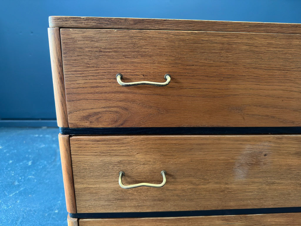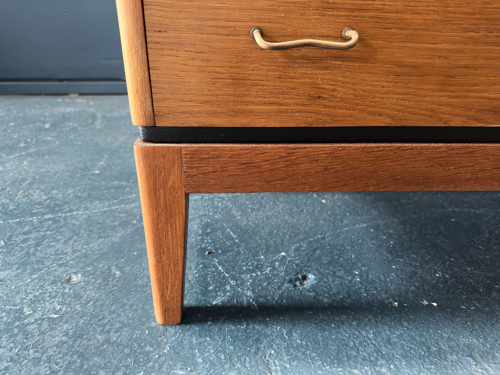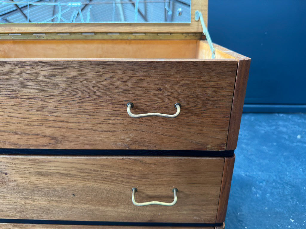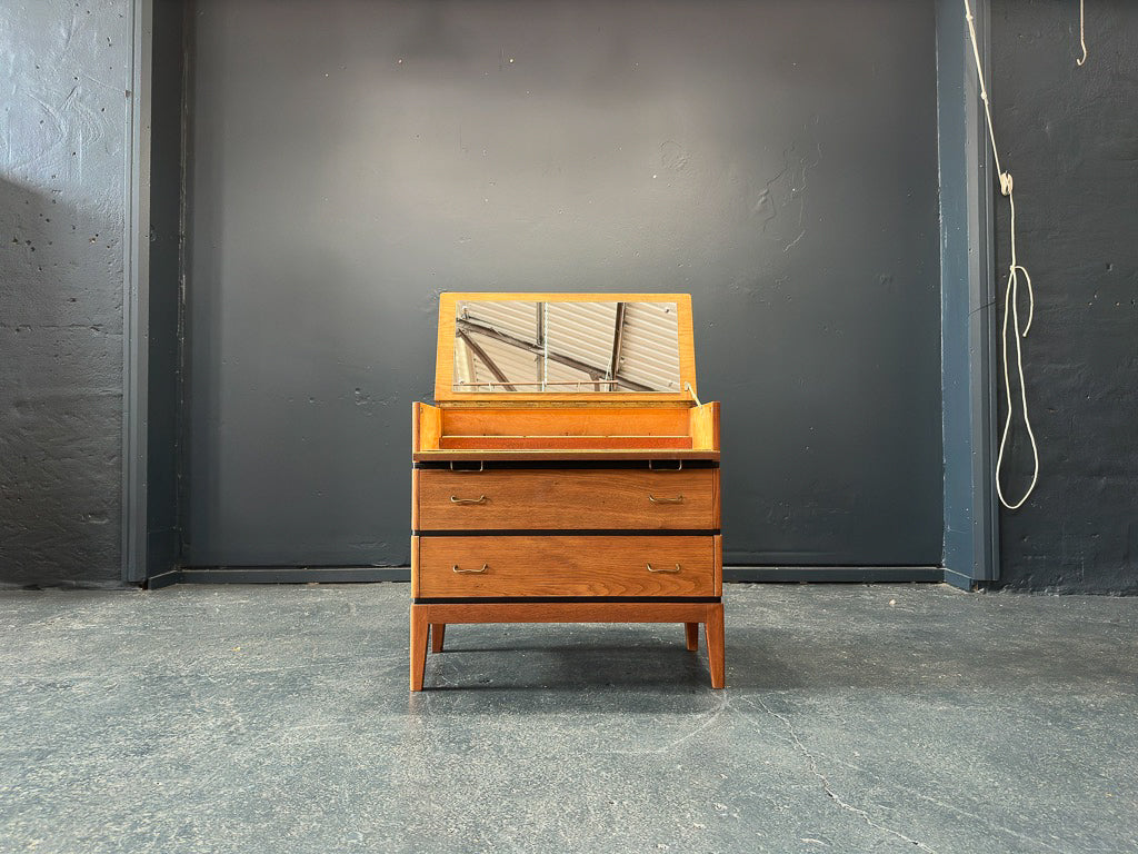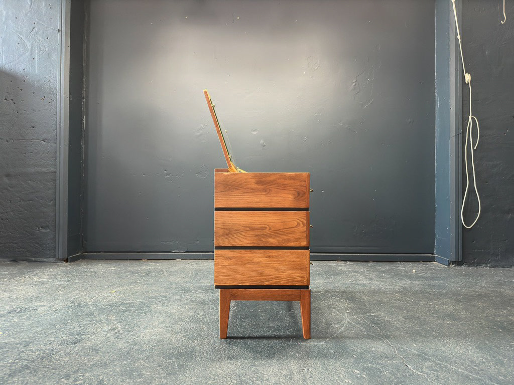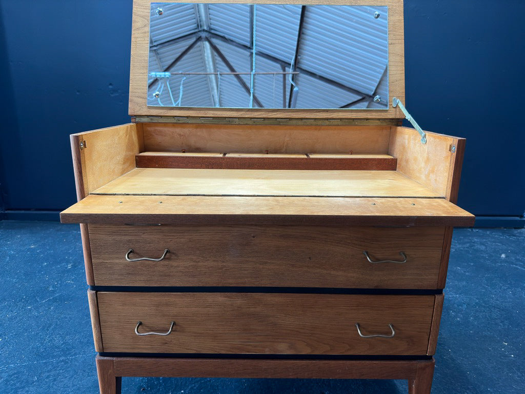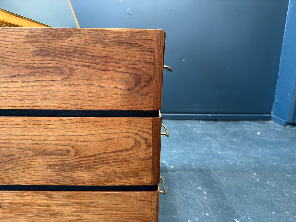 This modular chest of drawers is made from oak with slim brass handles, the top of the unit opens and folds down to reveal a vanity and built-in mirror. The vanity features three built-in compartments with removable lids. The unit is built of three elements that slot on top of one another with dowel fixtures, each drawer has black edge detailing and all sit on a strong oak frame with tapered legs.