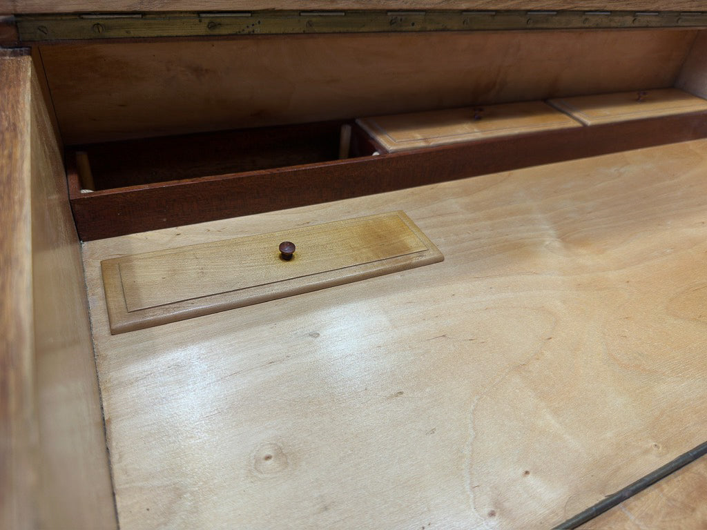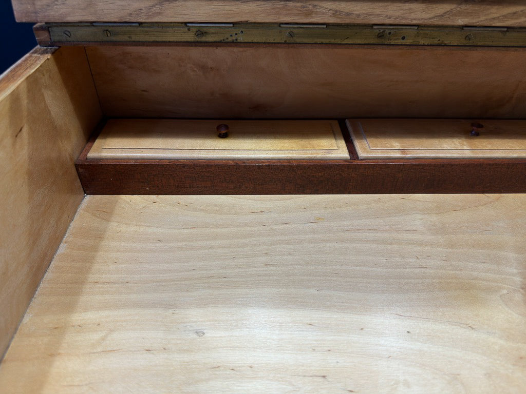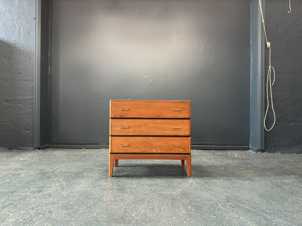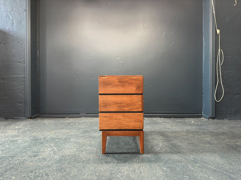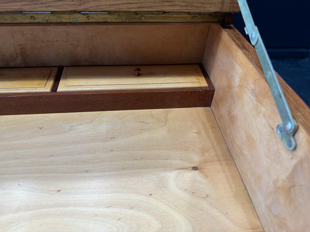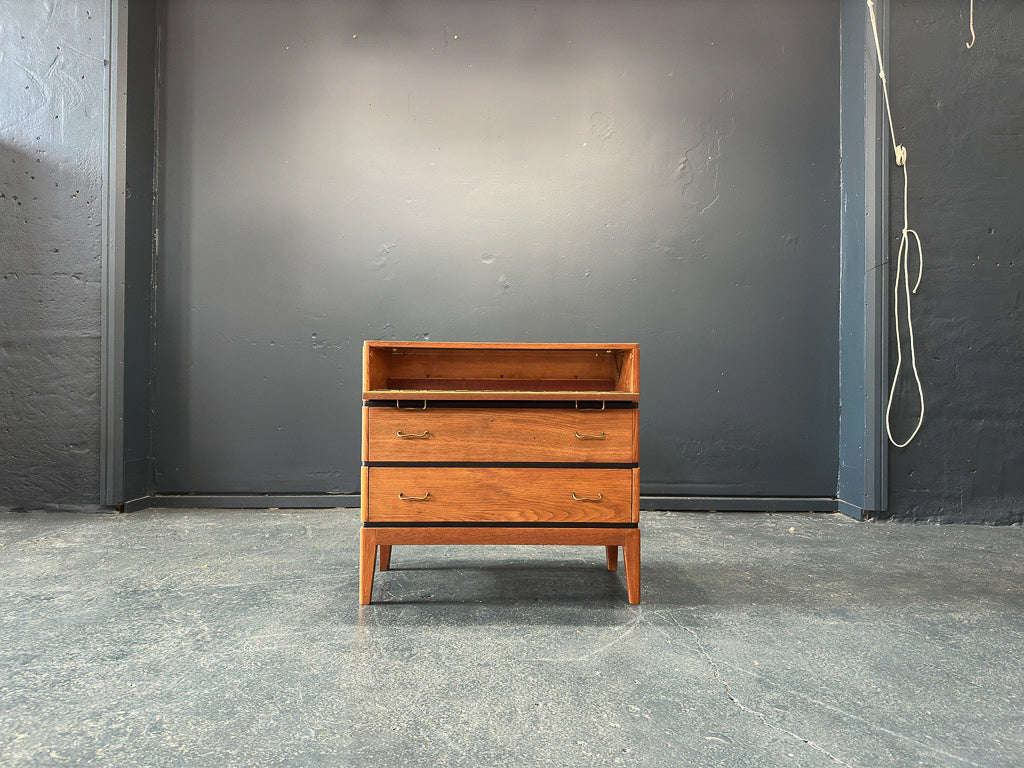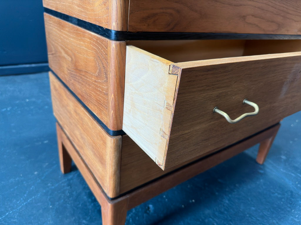 This modular chest of drawers is made from oak with slim brass handles, the top of the unit opens and folds down to reveal a vanity and built-in mirror. The vanity features three built-in compartments with removable lids. The unit is built of three elements that slot on top of one another with dowel fixtures, each drawer has black edge detailing and all sit on a strong oak frame with tapered legs.