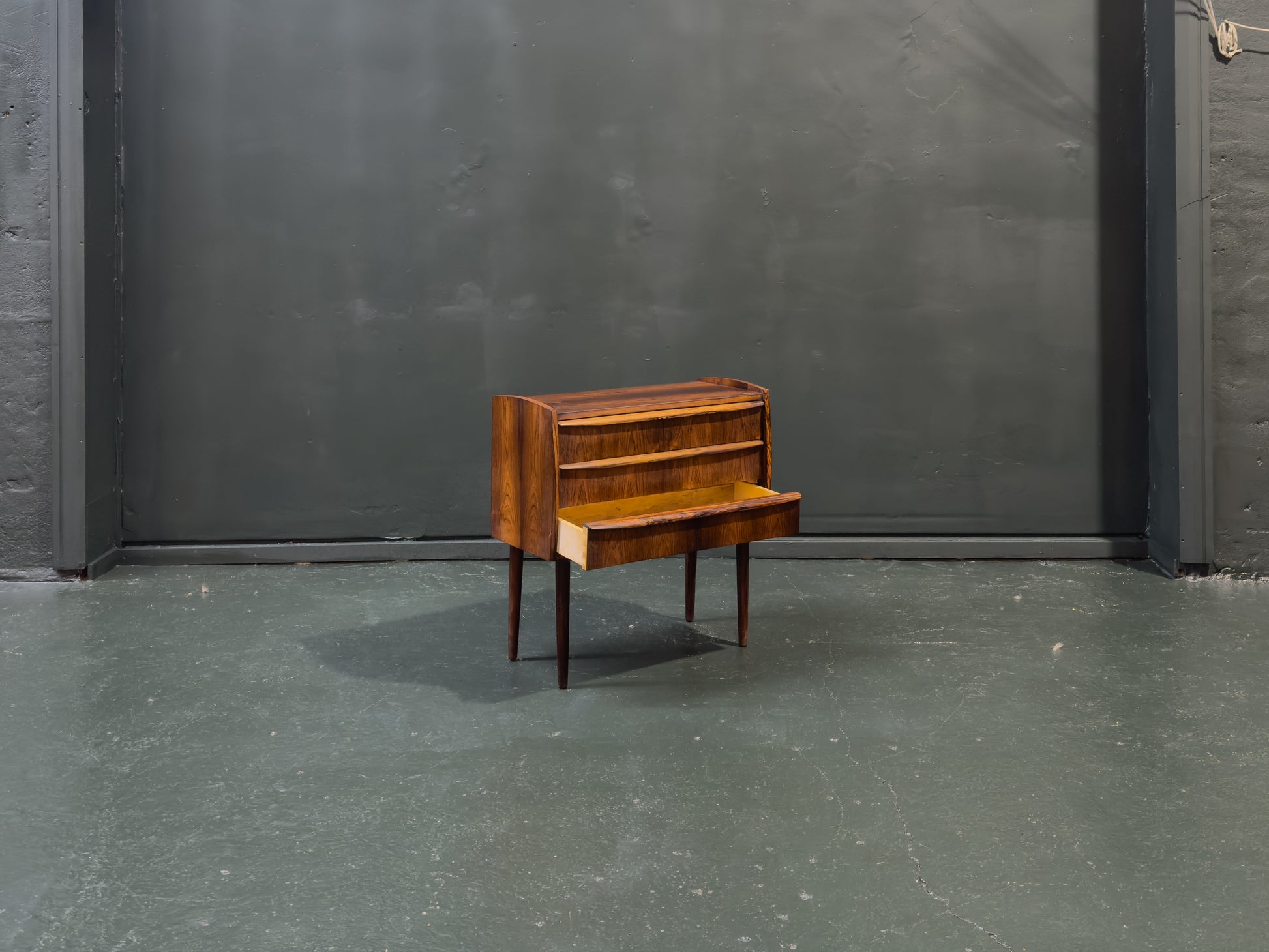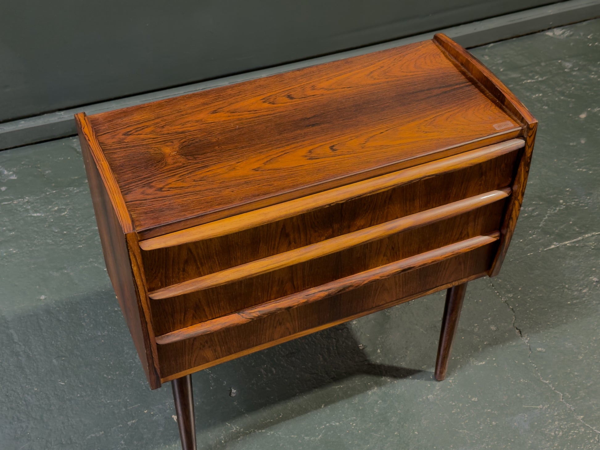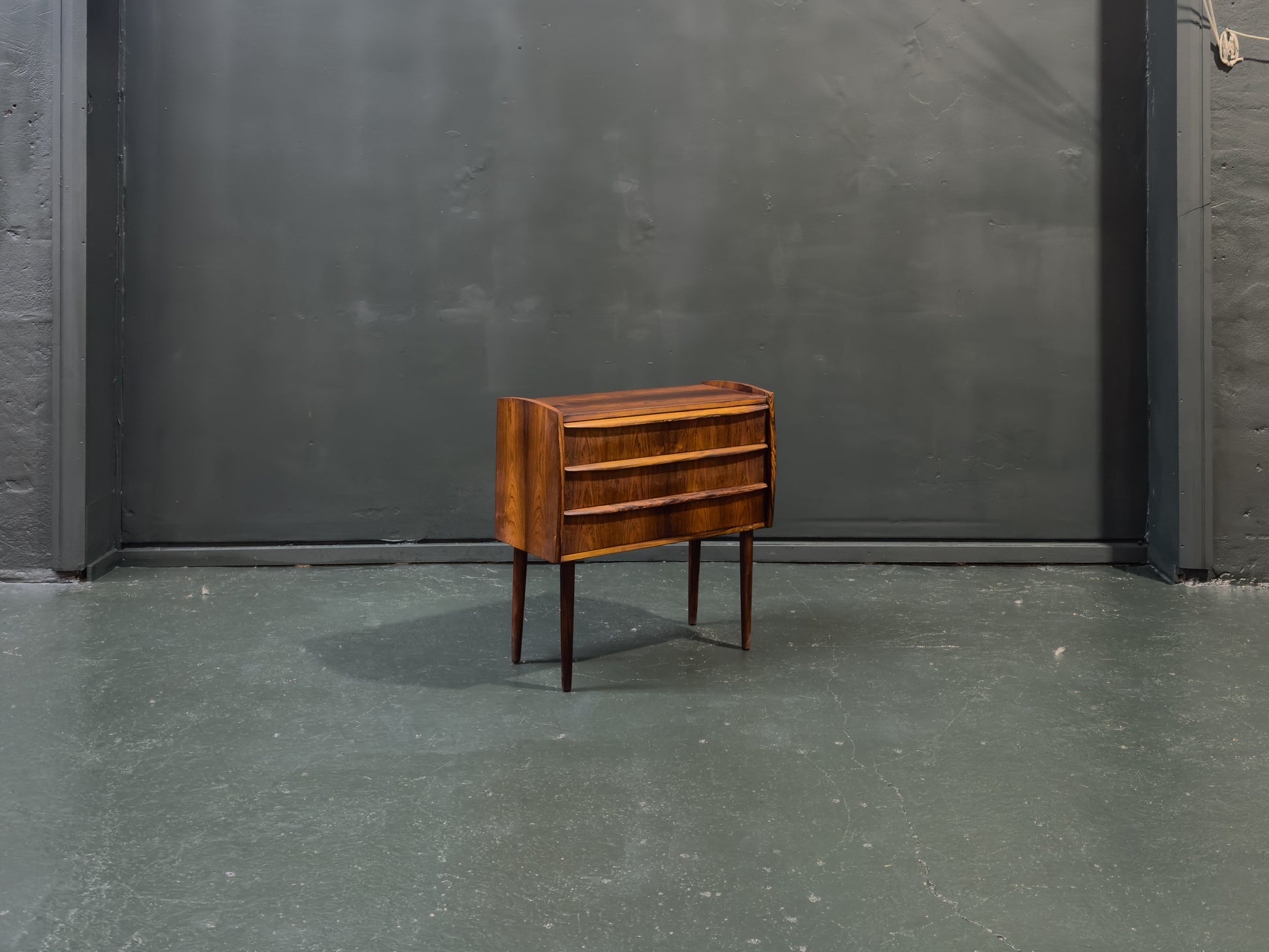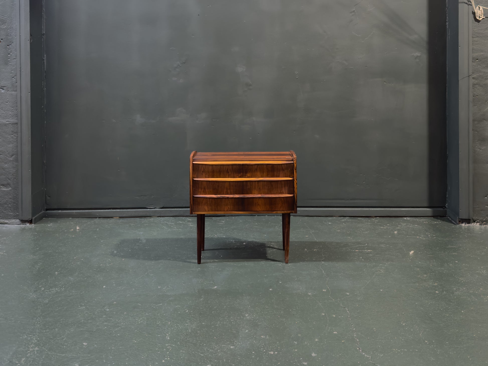 This small rosewood chest of drawers is refined and compact in size, yet rich in detail. Crafted from beautiful rosewood, the piece boasts a vibrant grain pattern with swirling tones of deep brown and red, giving it a luxurious visual depth.
