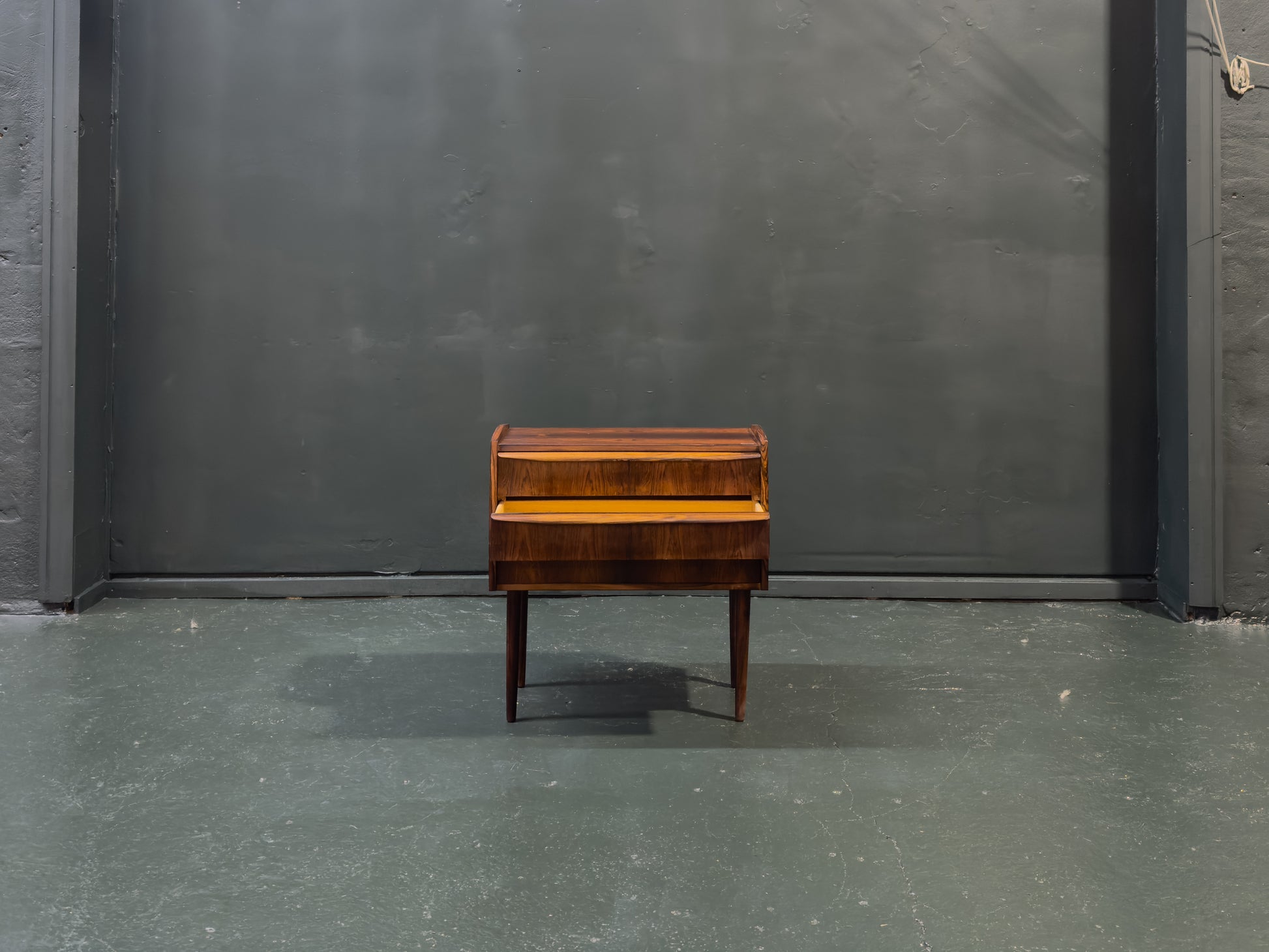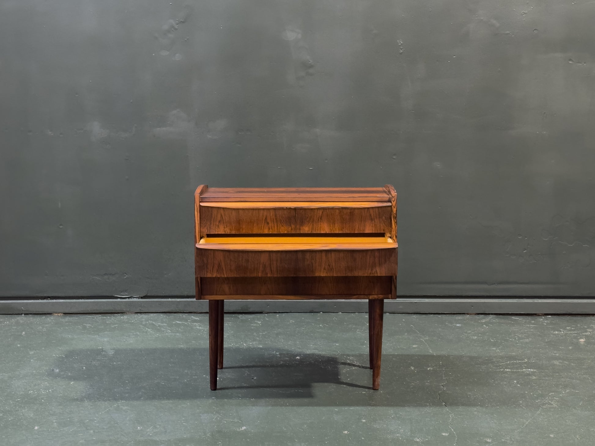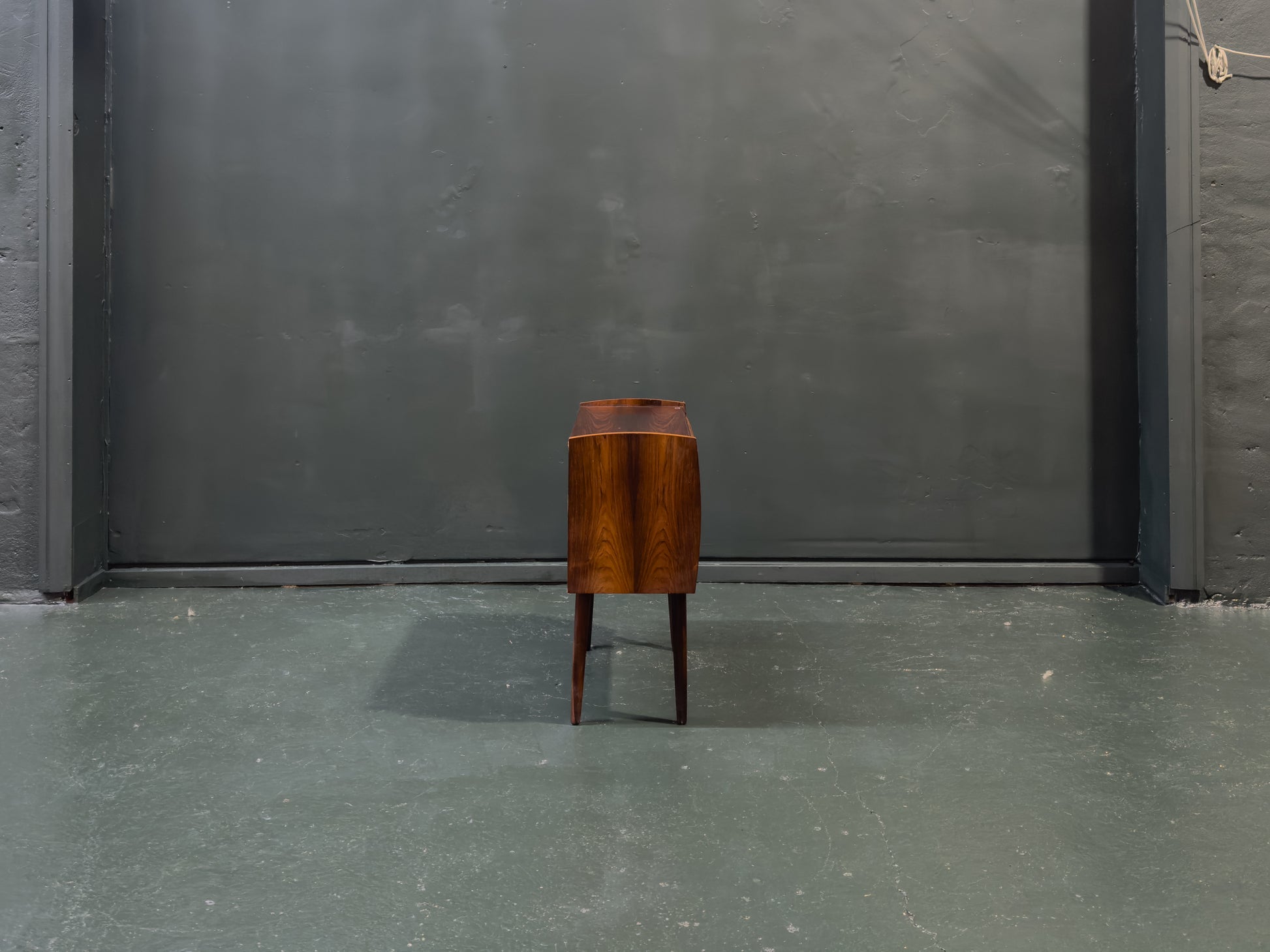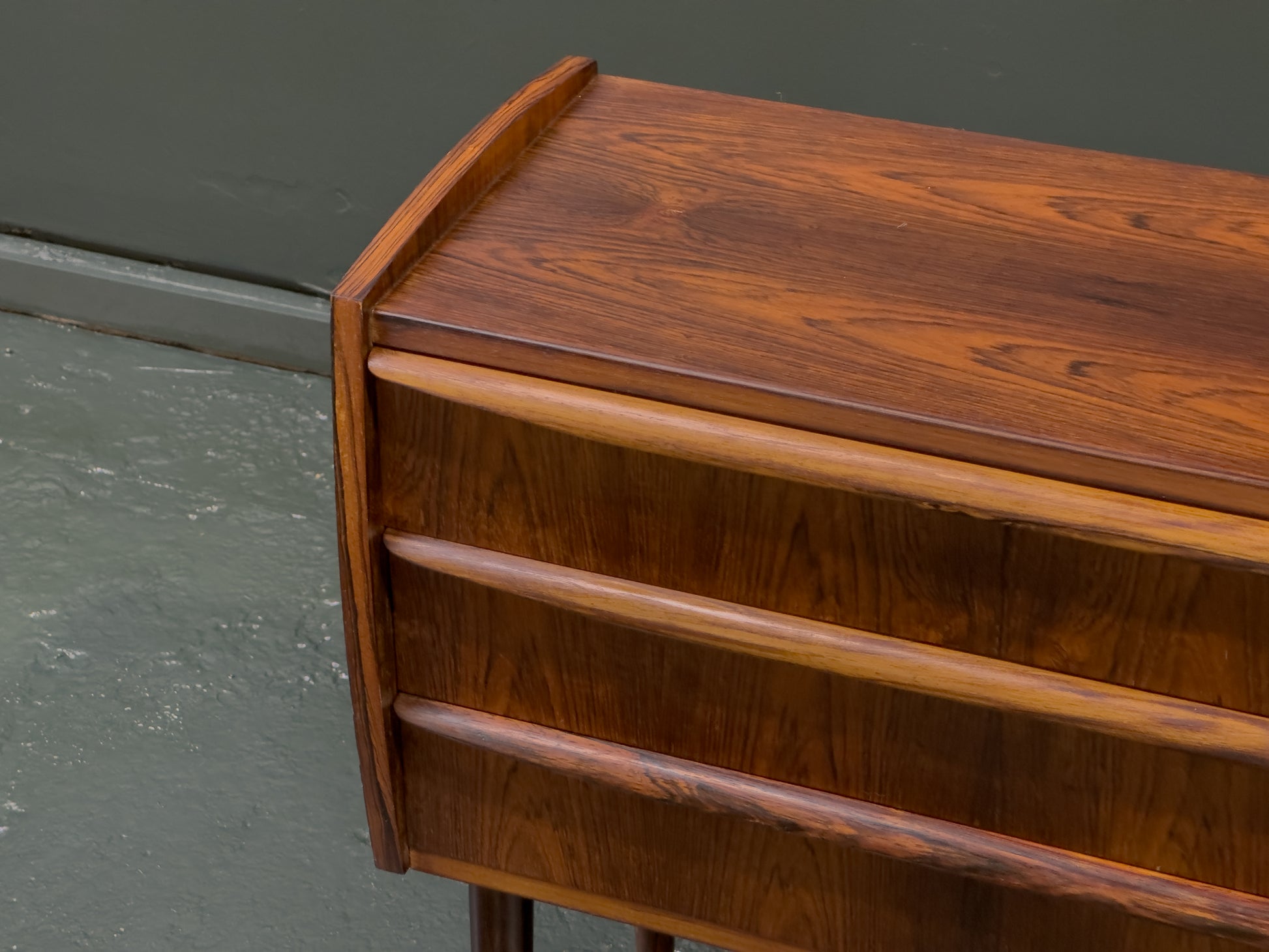 This small rosewood chest of drawers is refined and compact in size, yet rich in detail. Crafted from beautiful rosewood, the piece boasts a vibrant grain pattern with swirling tones of deep brown and red, giving it a luxurious visual depth.