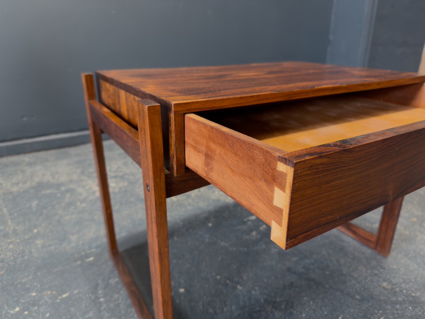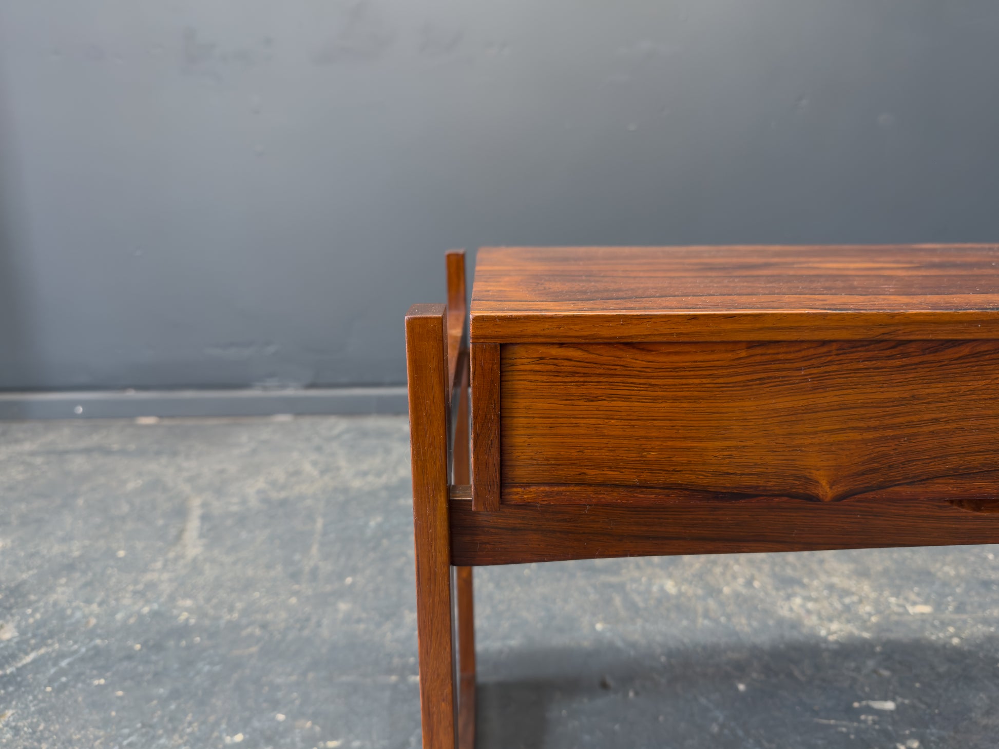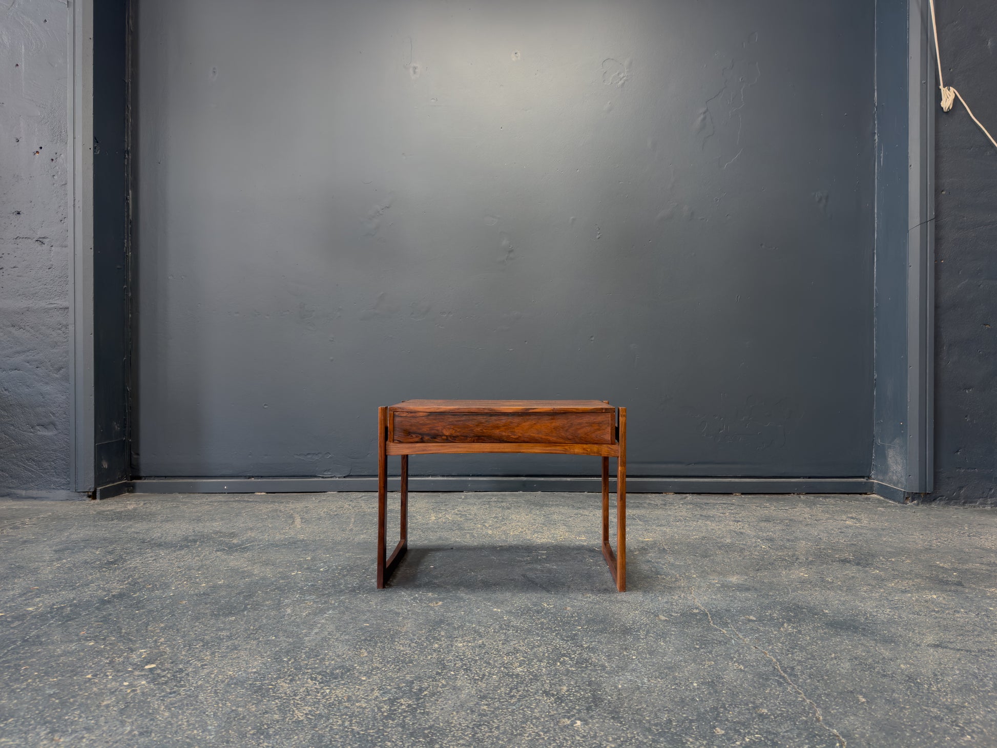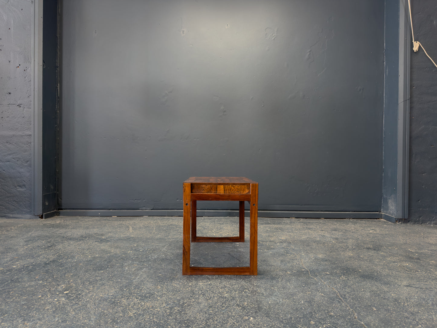 This compact rosewood chest of drawers exemplifies minimalism elevated by expert craftsmanship and intelligent design. Its sleek, rectangular silhouette is defined by clean lines and a floating visual lightness, thanks in large part to its open, squared-leg frame — a modernist nod that gives the piece both structure and sculptural grace.