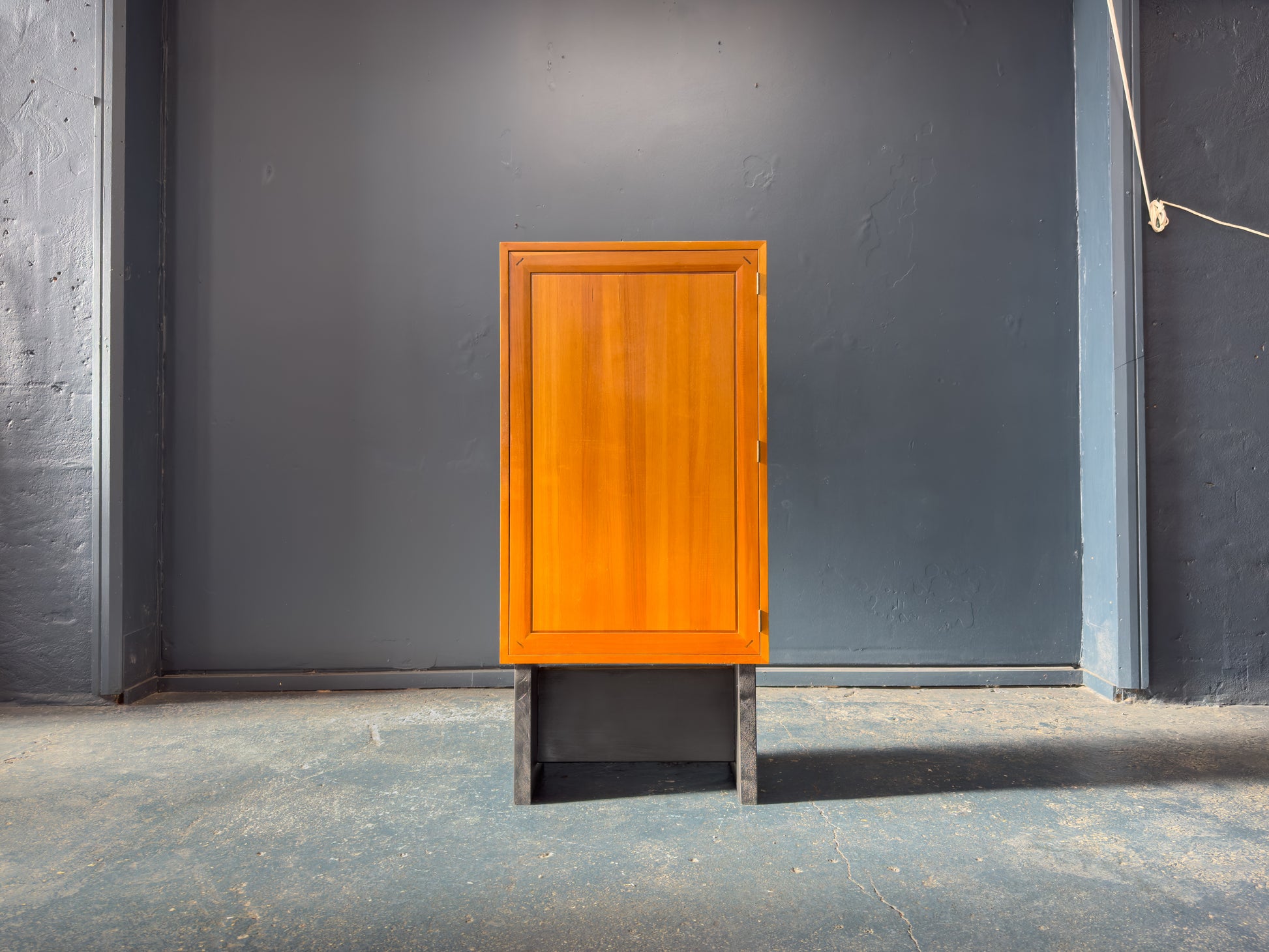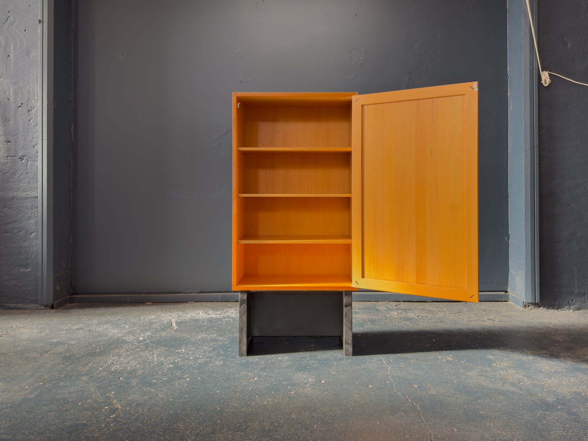 Wonderfully crafted this piece showcases subtle details, such as the wooden joiner of the door frame. Each detail enhancing the simple design of this piece, showcasing the attention to detail. Once opened the door reveals three shelves, providing ample storage and versatile use.