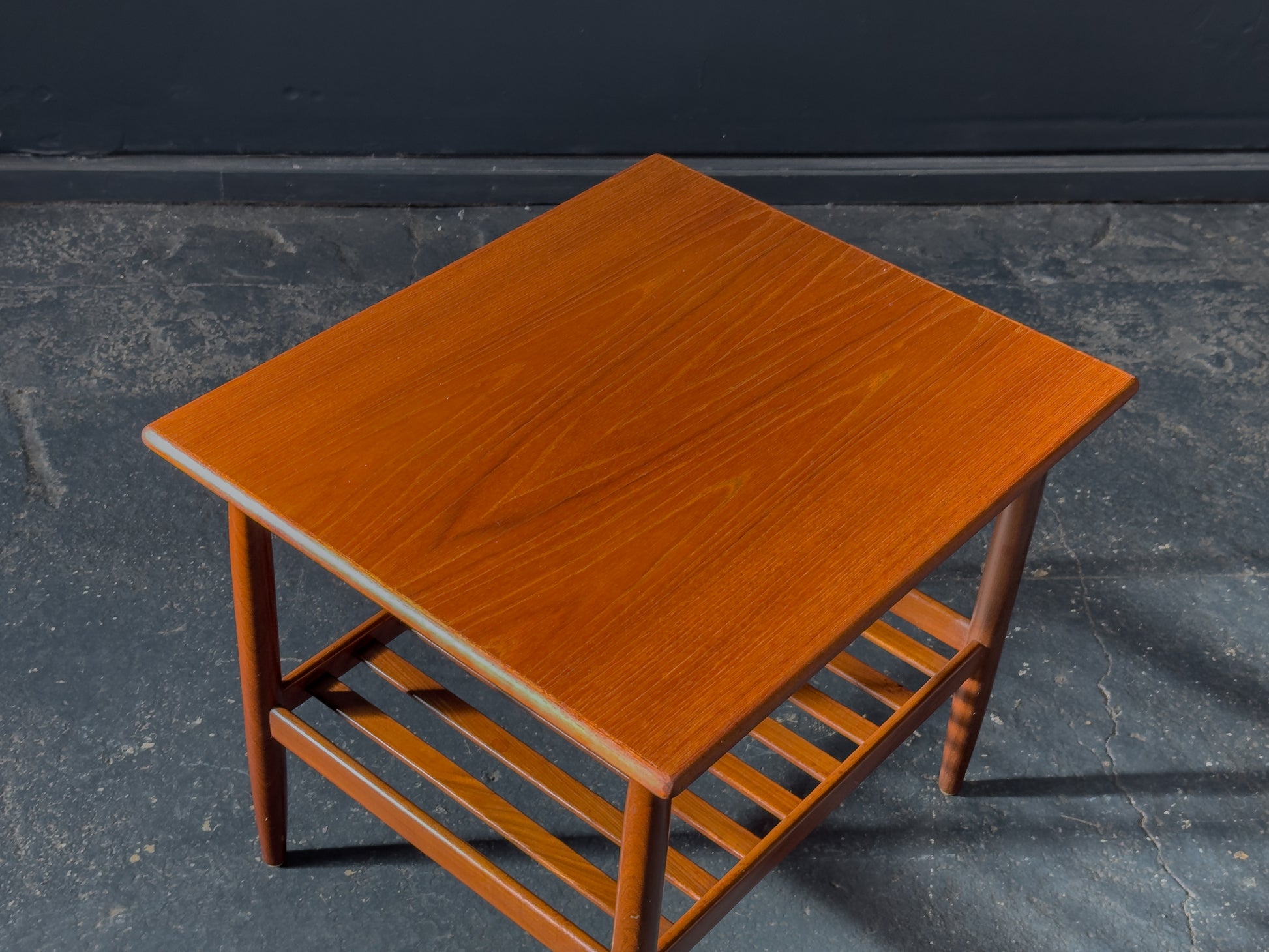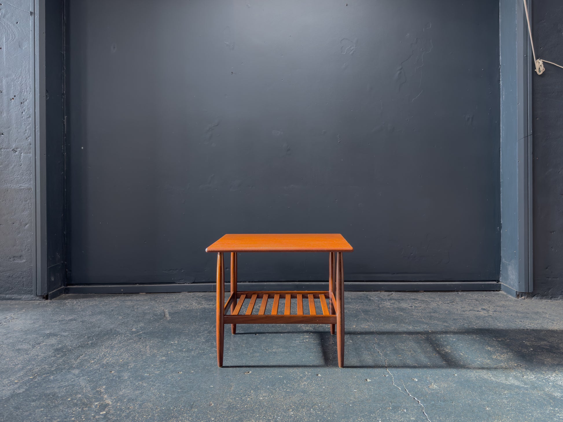This teak end table by Møbelfabrik Toften is a fine example of Danish modern design, where functionality and elegance meet in perfect harmony. The tabletop displays the rich, warm tones and distinctive grain patterns of teak, finished with crisp, clean edges that highlight the precision of its craftsmanship. Beneath, a slatted lower shelf adds both practicality and visual rhythm, providing an ideal space for magazines, books, or decorative objects.