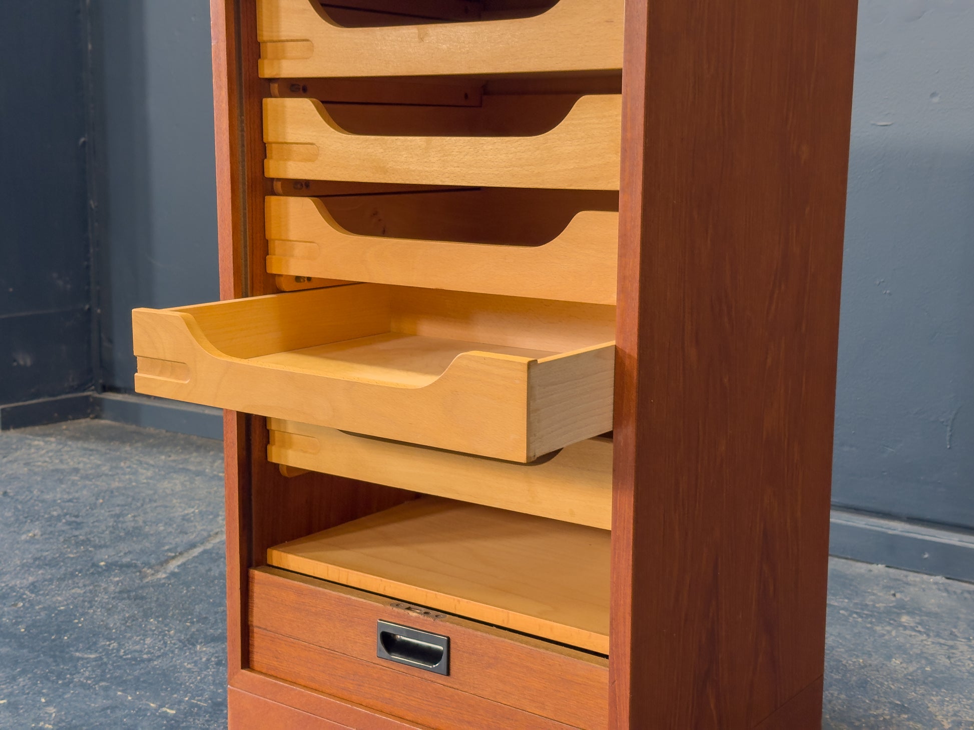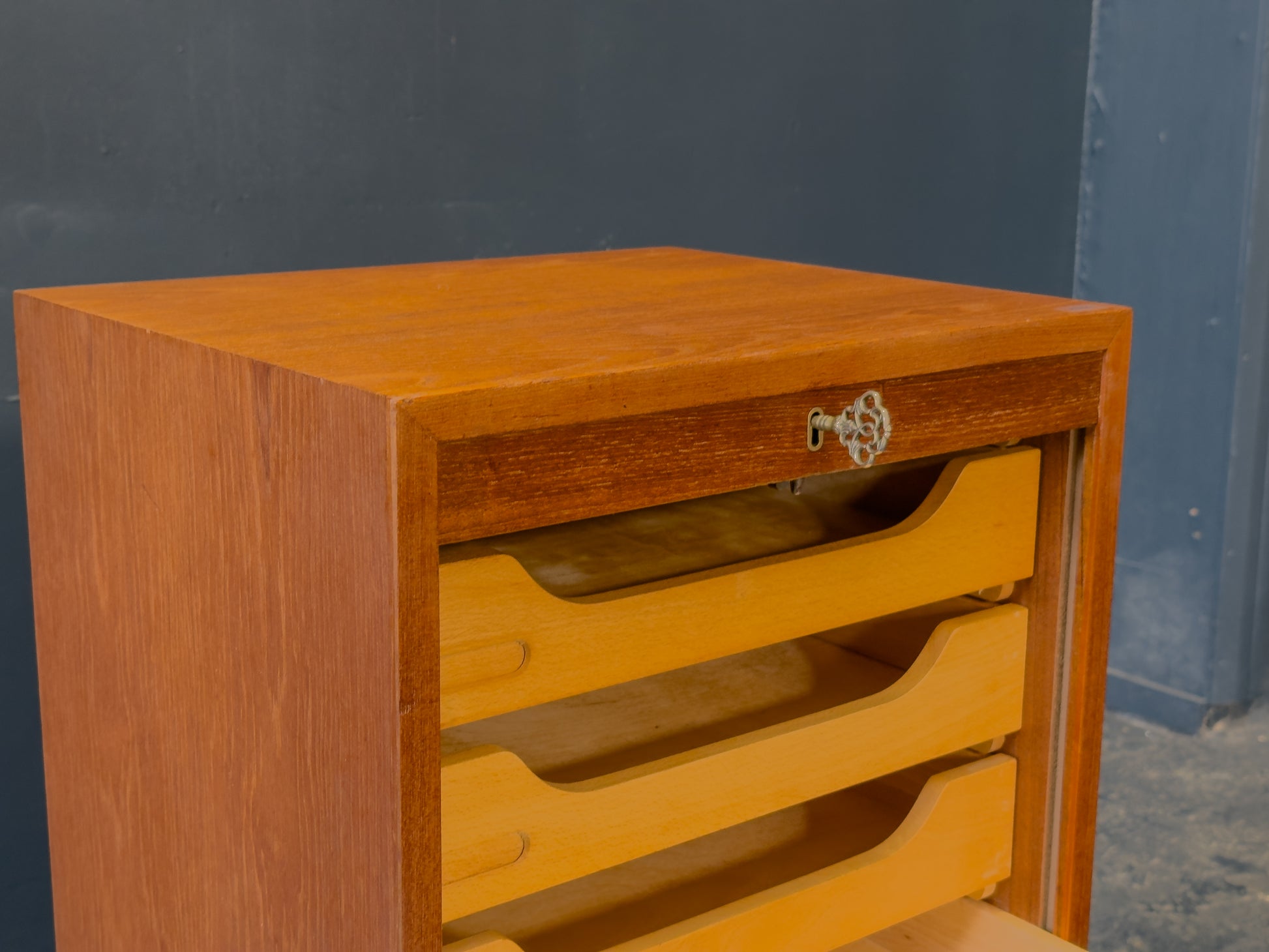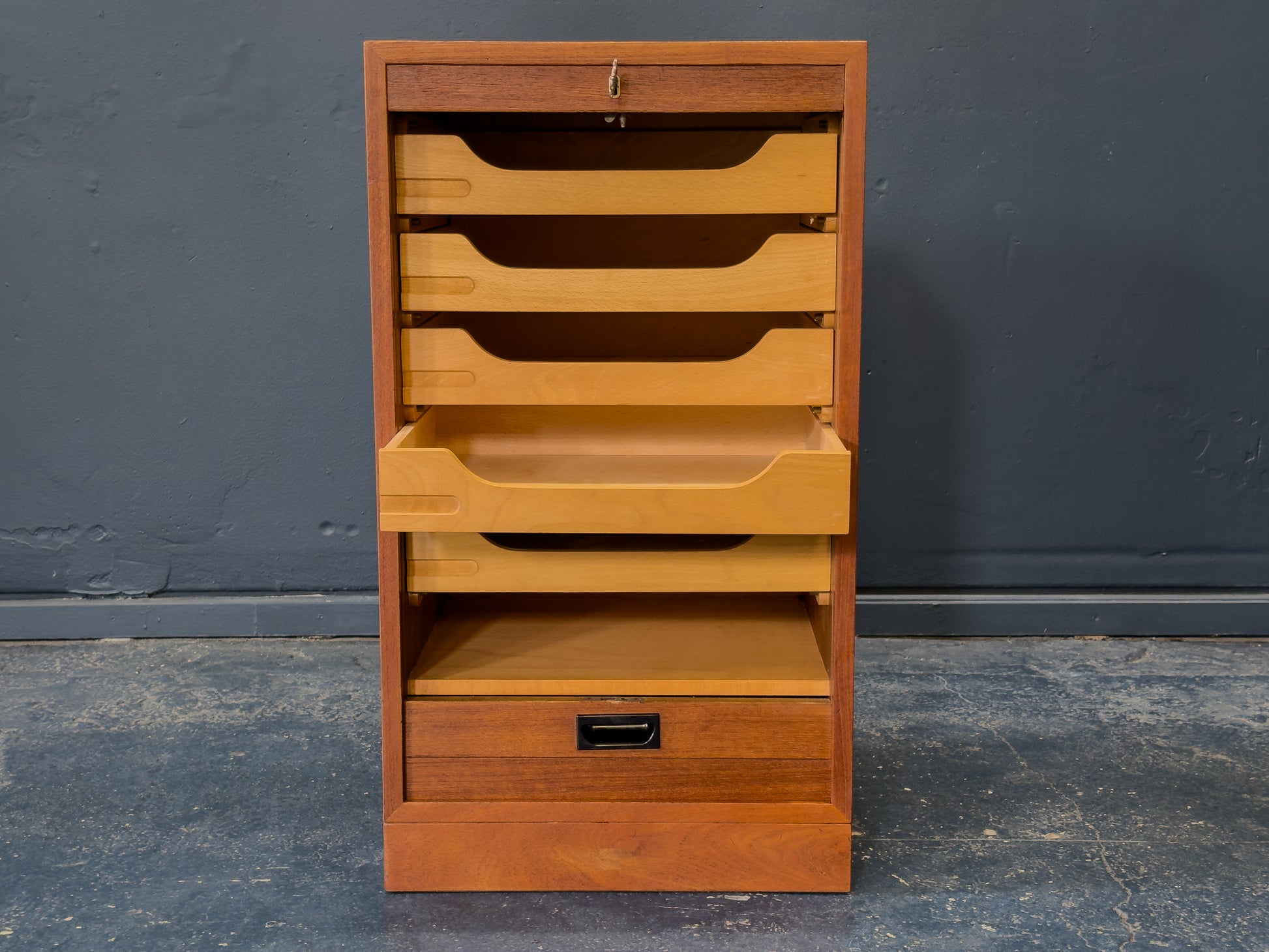 The wonderful wood construction, warm mid-century tones, and simple, practical layout make it ideal for a studio, office, or home workspace. Its compact size allows it to fit neatly under or beside a desk while adding a touch of classic craftsmanship