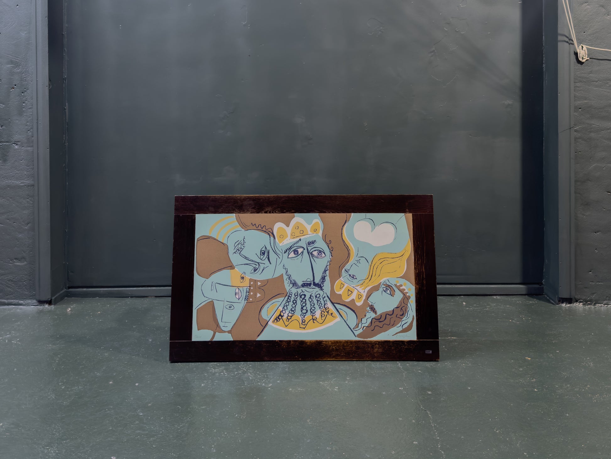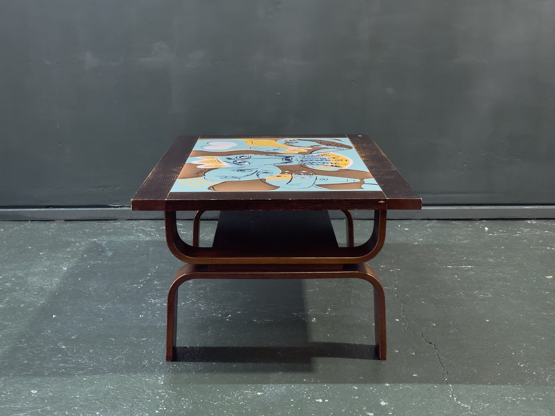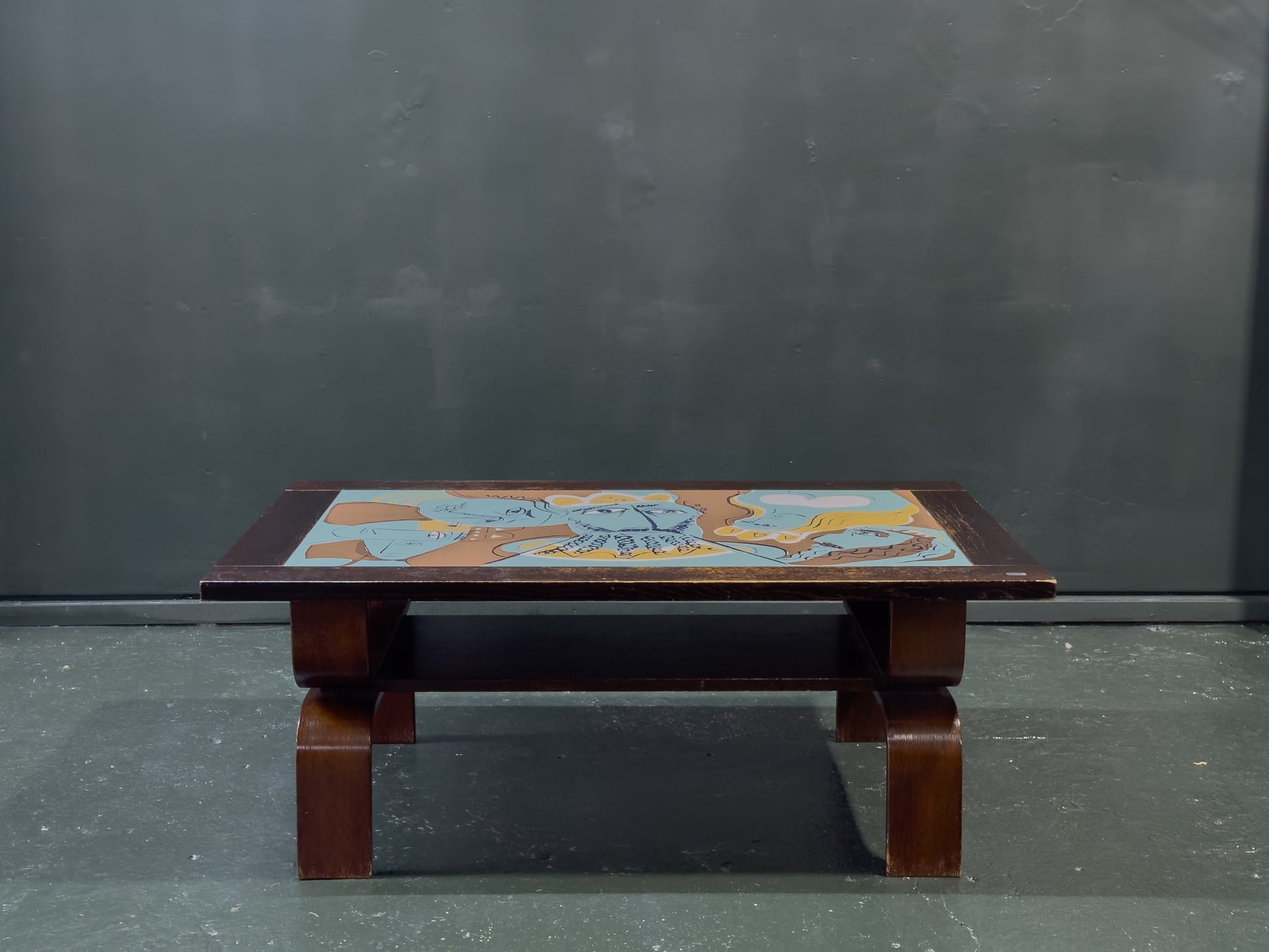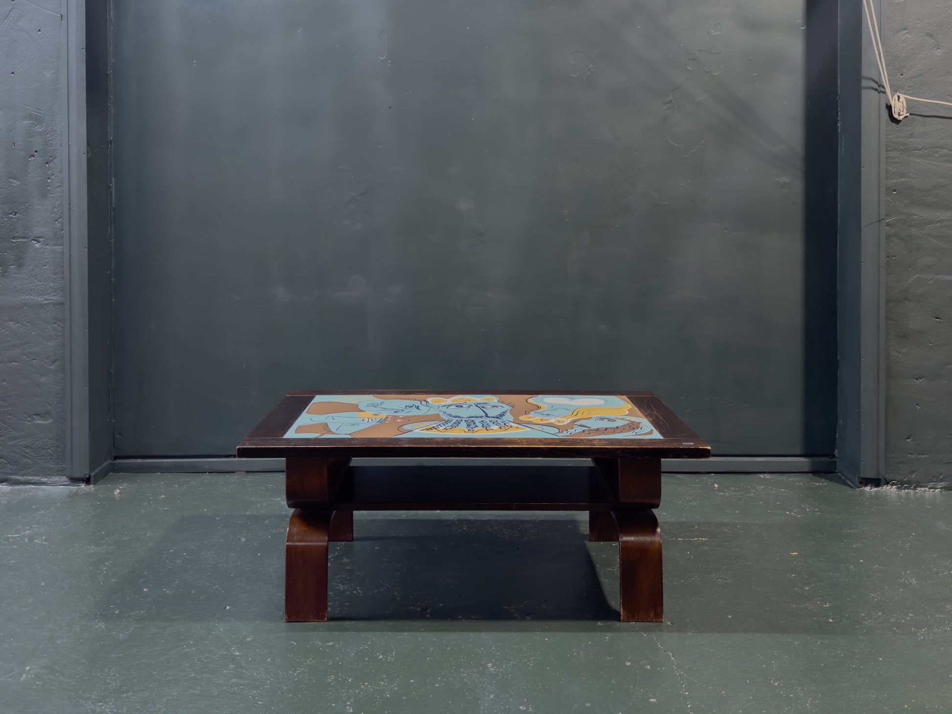 Above, the inset top panel showcases a wonderful print by artist Lennart Rosensohn. The golden tones and bright blues, provide a contrast with the depth and richness of the dark frame. From every angle, the piece presents a strong sculptural identity. Expressive, balanced, and unmistakably designed, this table is a real statement piece.