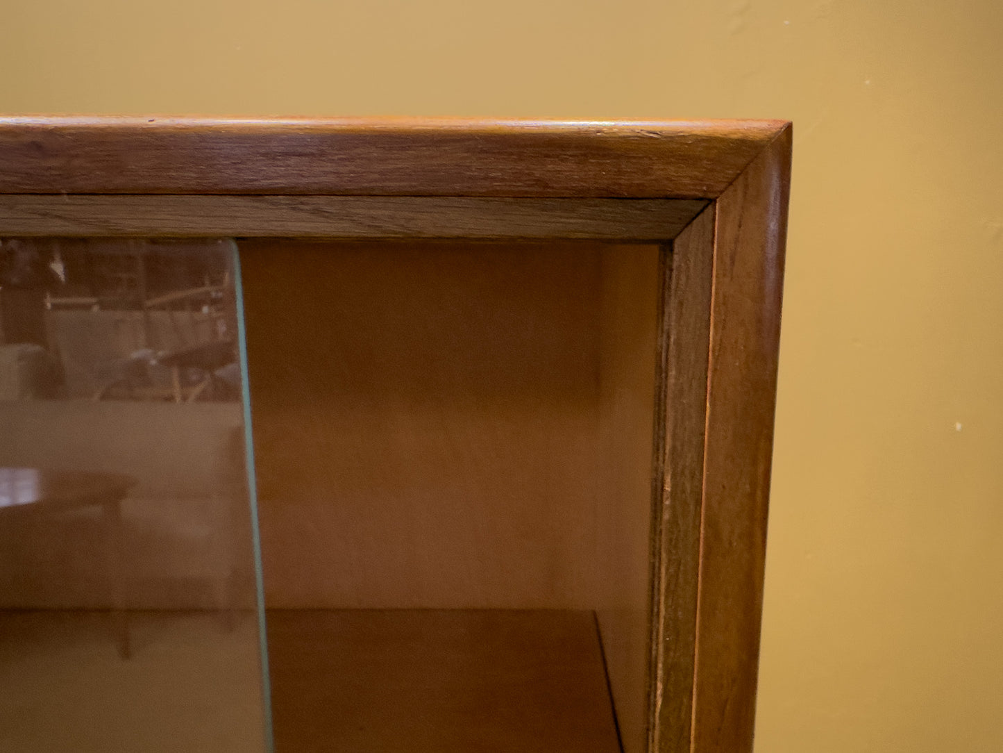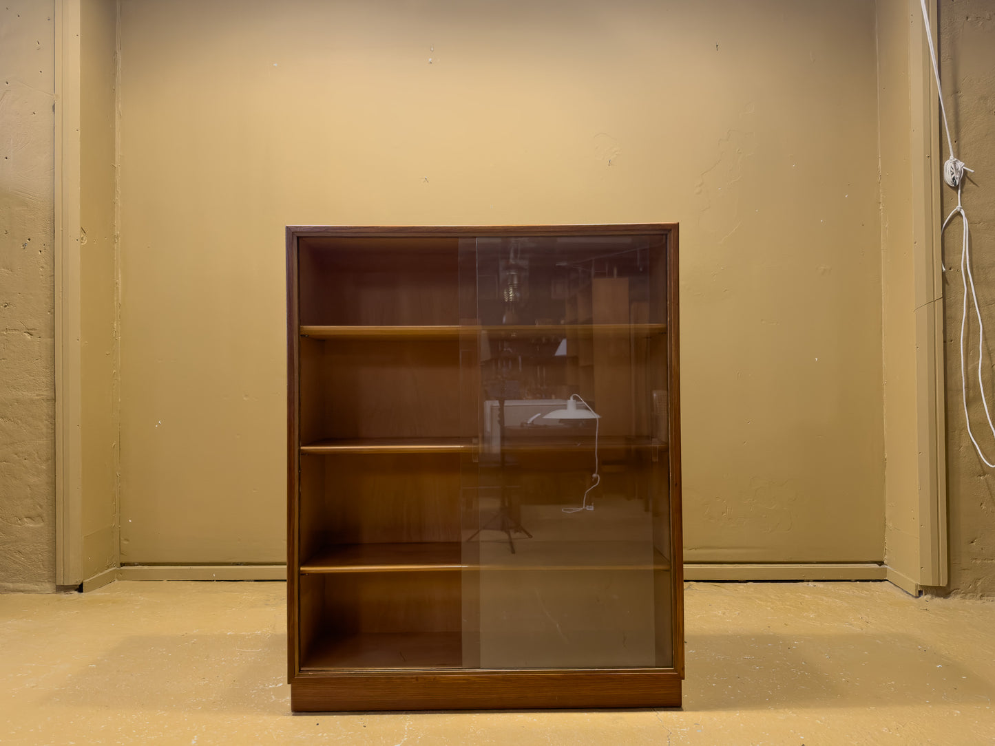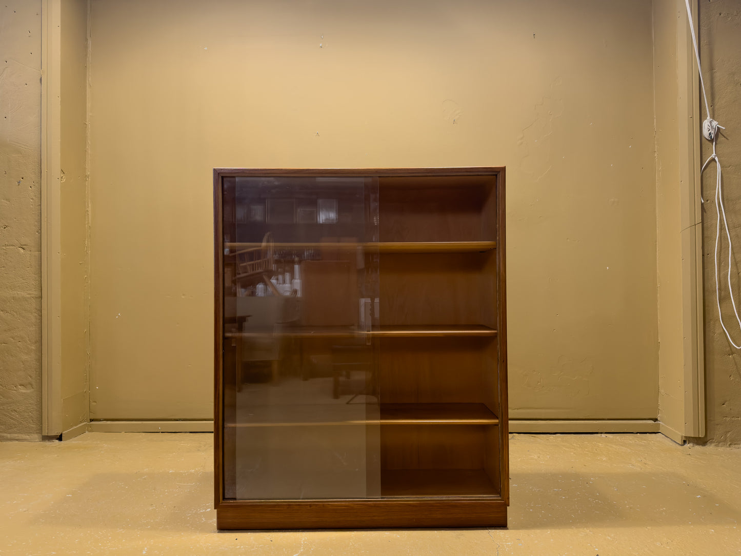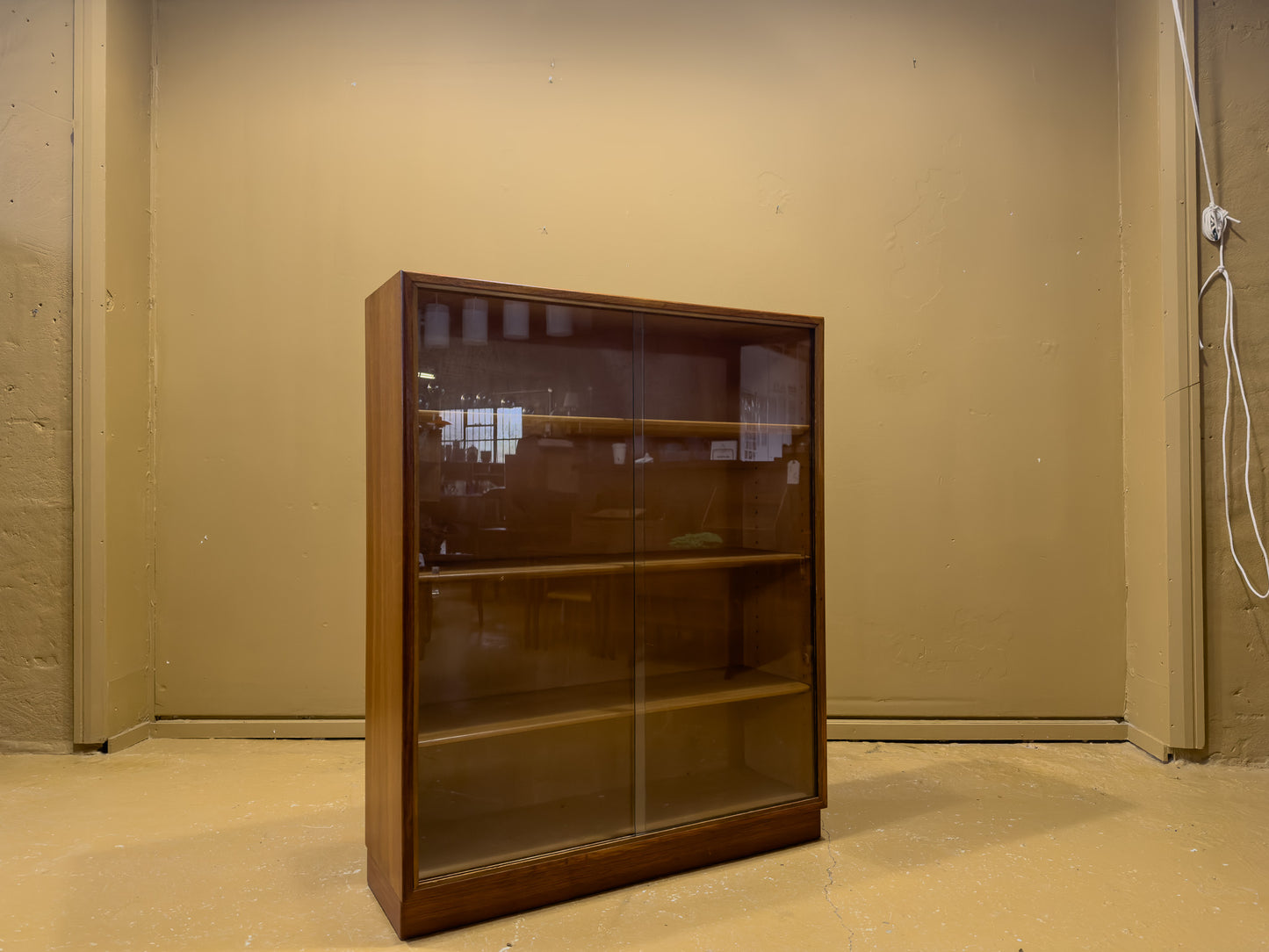 Substantial teak and beech display cabinet with sliding glass doors and 3 interior shelves.