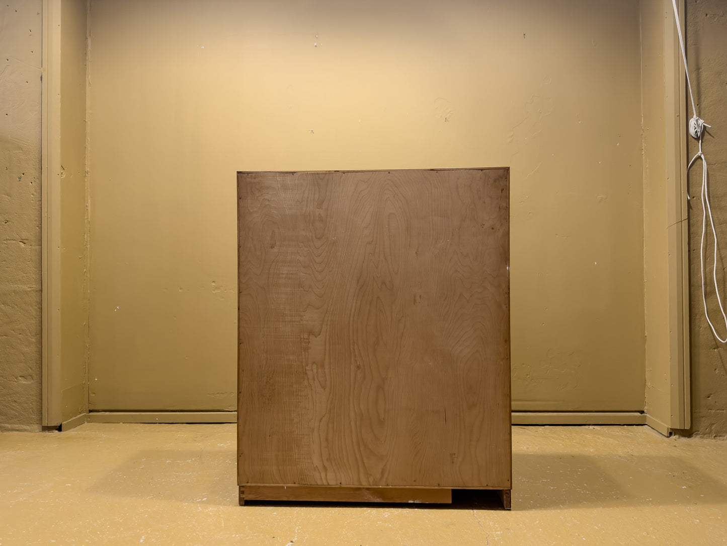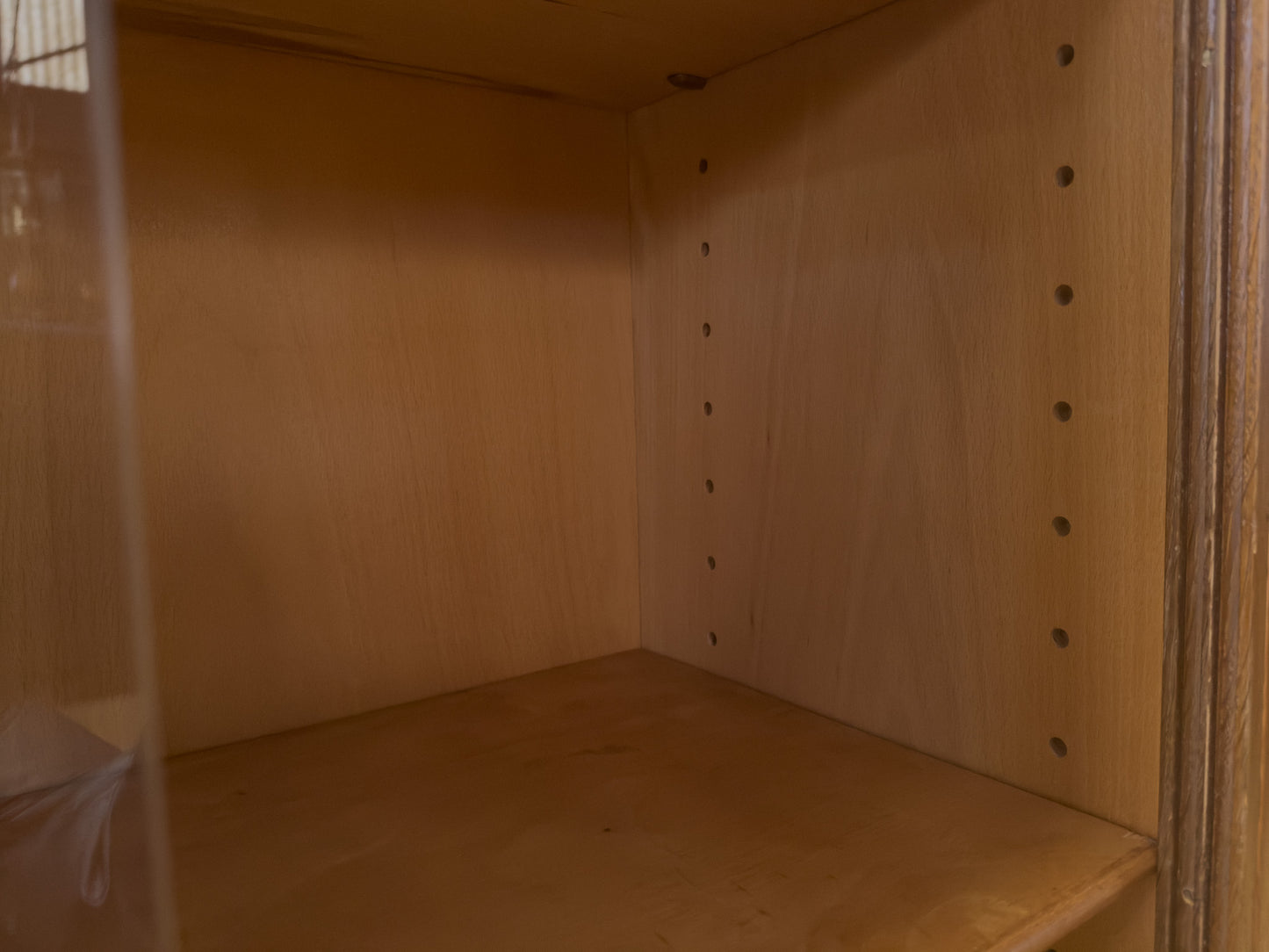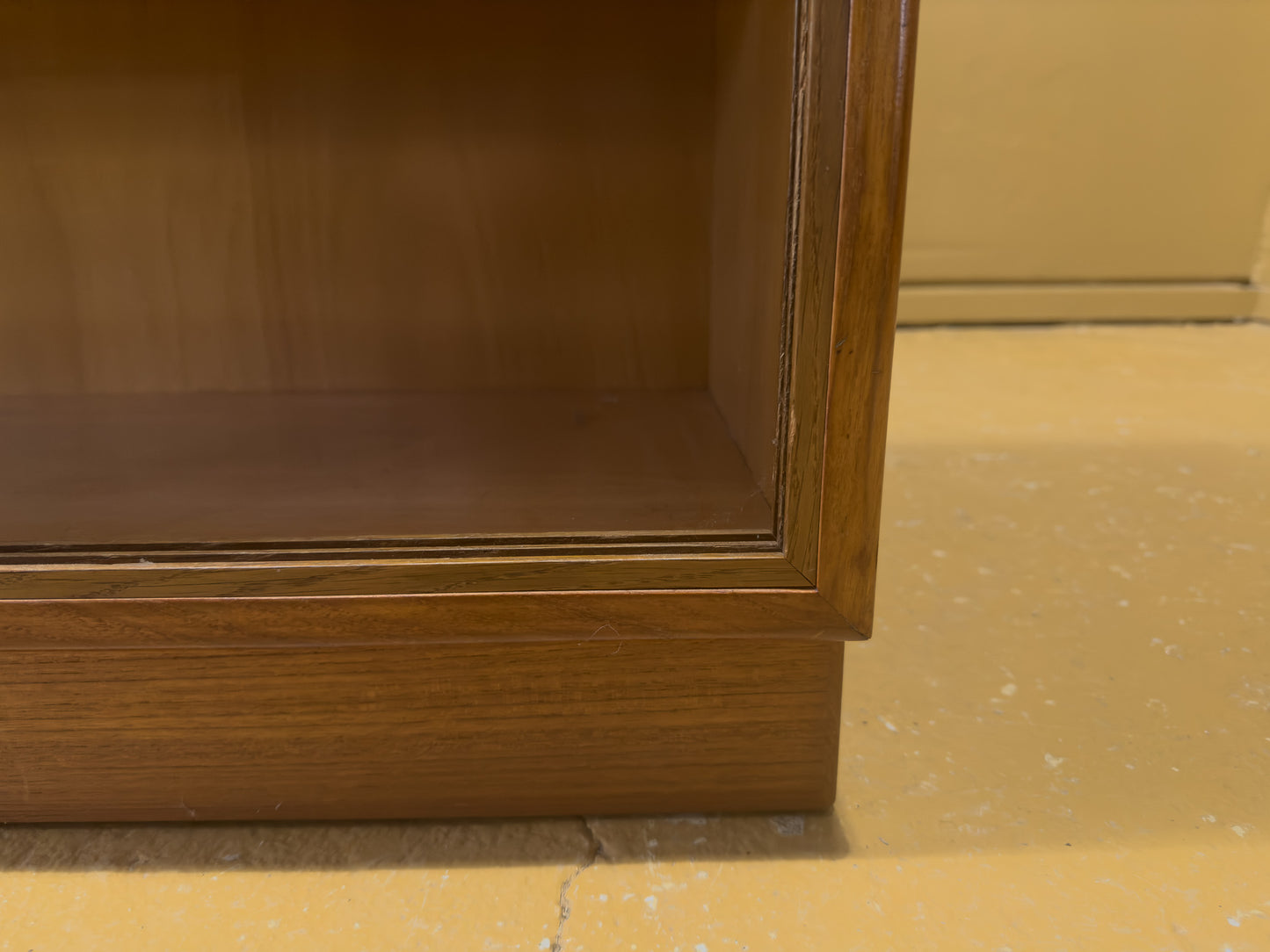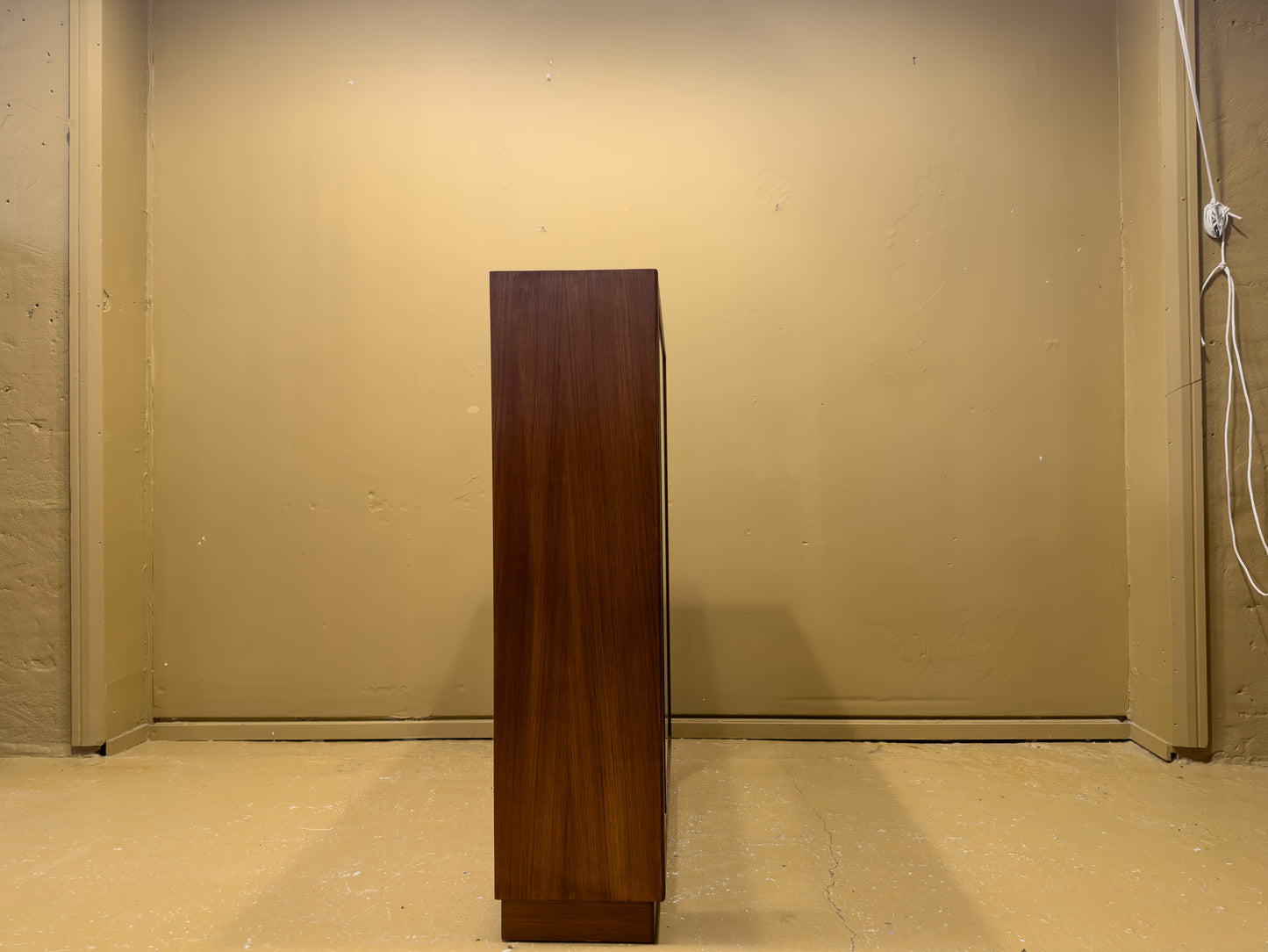 Substantial teak and beech display cabinet with sliding glass doors and 3 interior shelves.