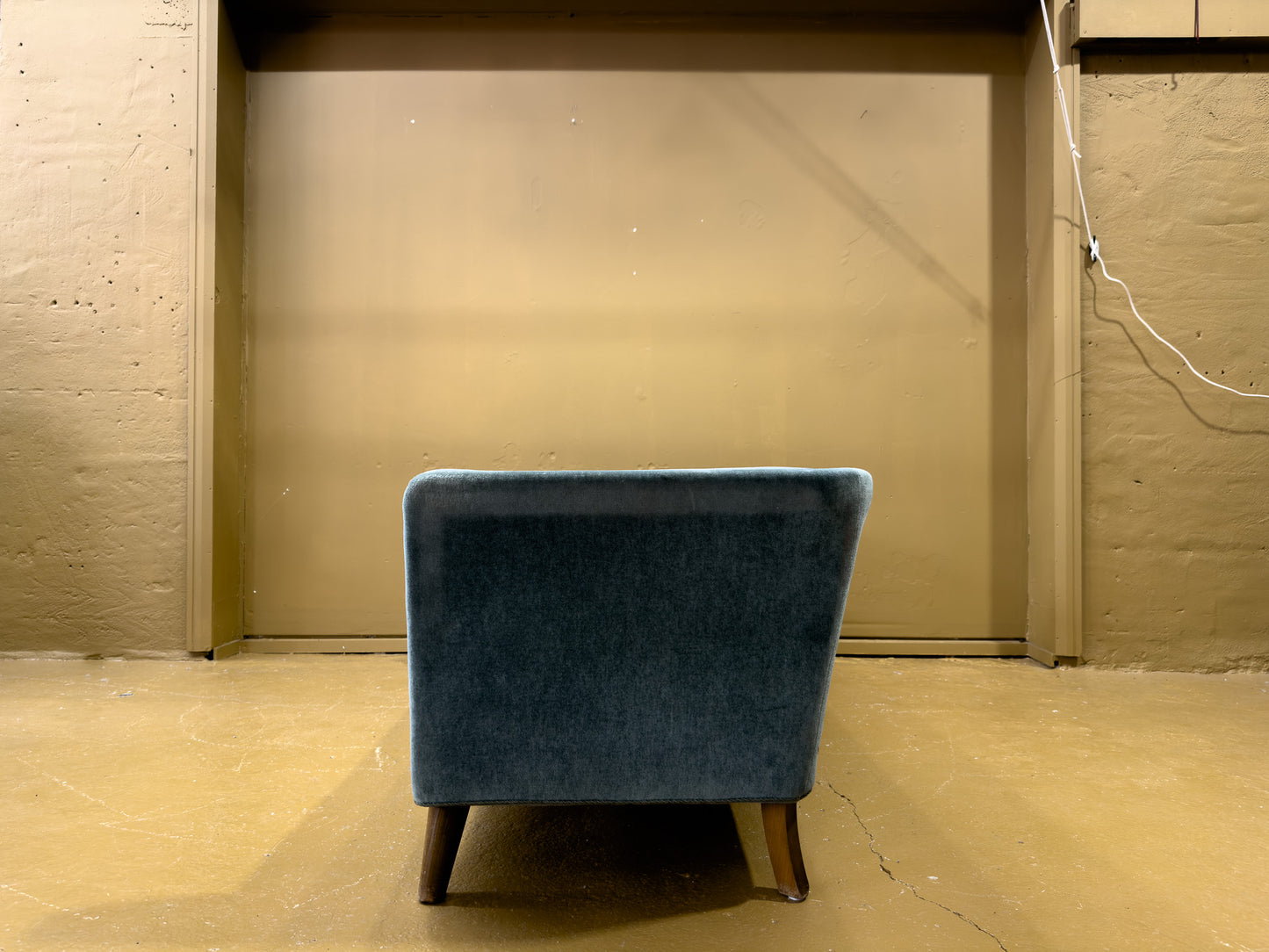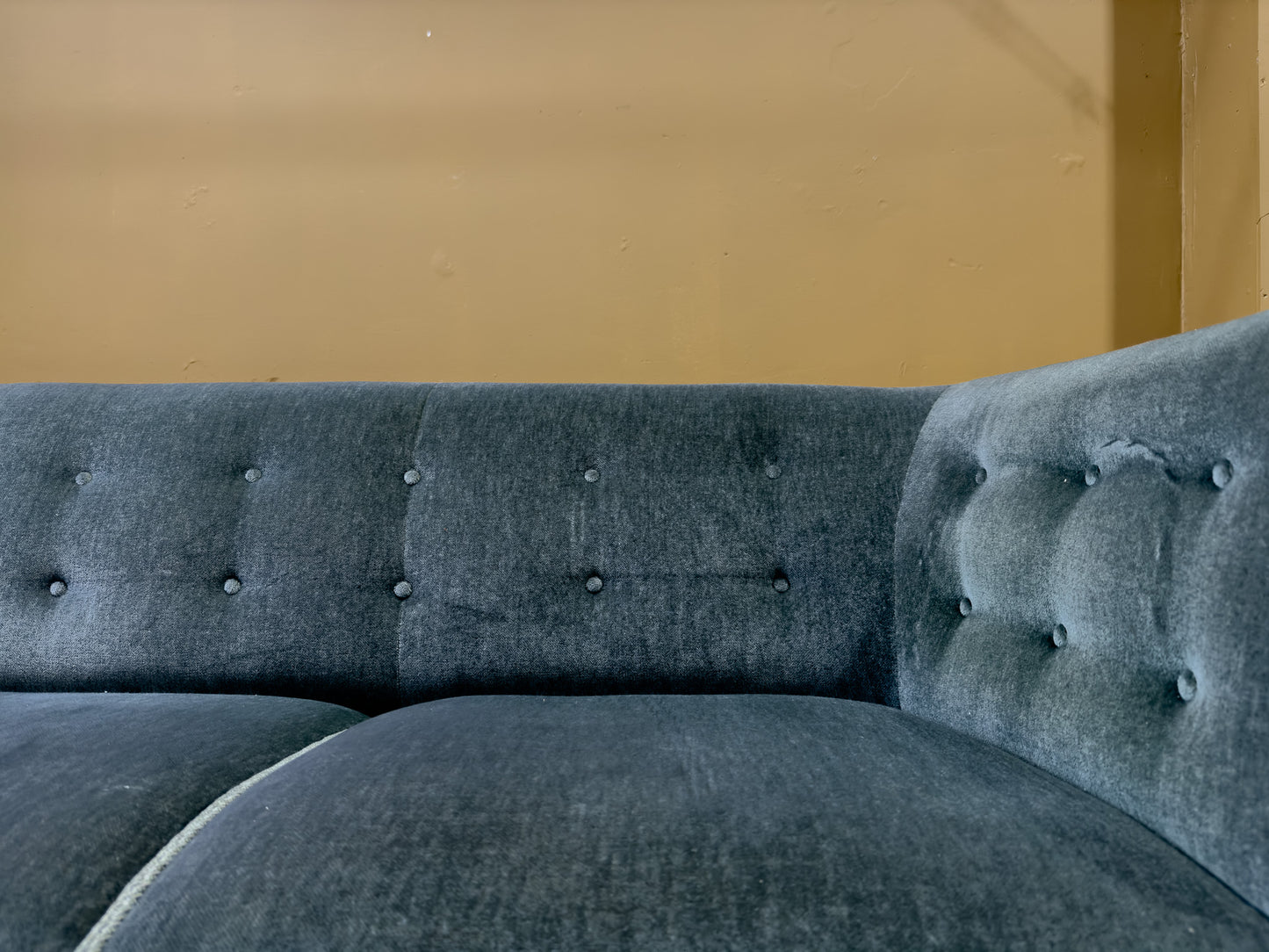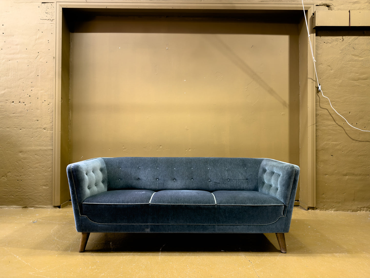 Super quality sprung sofa in its original blue velvet in excellent condition. Beautifully detailed. Looks contemporary but is completely original. Danish, 1950s.